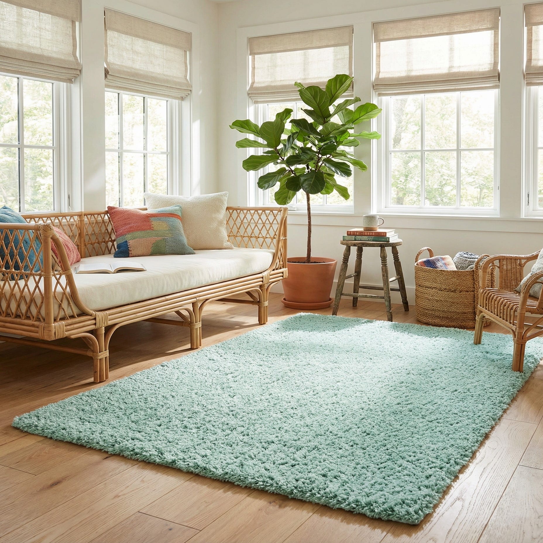 This rug works well wherever you want a calm, cool accent—layer it in a contemporary living room beneath a low coffee table, place it beside the bed to add a comforting step in the morning, or use it to brighten a nursery or reading nook. It pairs naturally with light woods and white or navy textiles for a coastal or Scandinavian look, or with warm metallics and minimalist furniture for a modern, relaxed vibe.