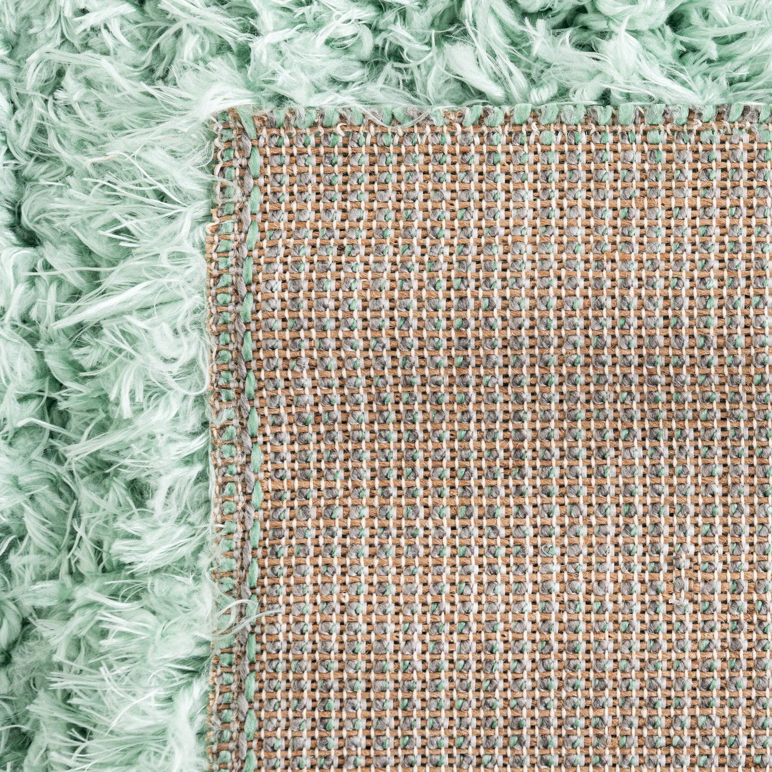 A lush, high-pile shag in a clean cyan hue creates a soft, monochromatic surface with a gentle, rippled texture. The dense polyester fibers reflect light differently across the pile, giving the rug subtle depth without any defined pattern. Machine made from 100% polyester, the construction yields a cushiony, velvety hand that invites bare feet and adds tactile warmth to any room.