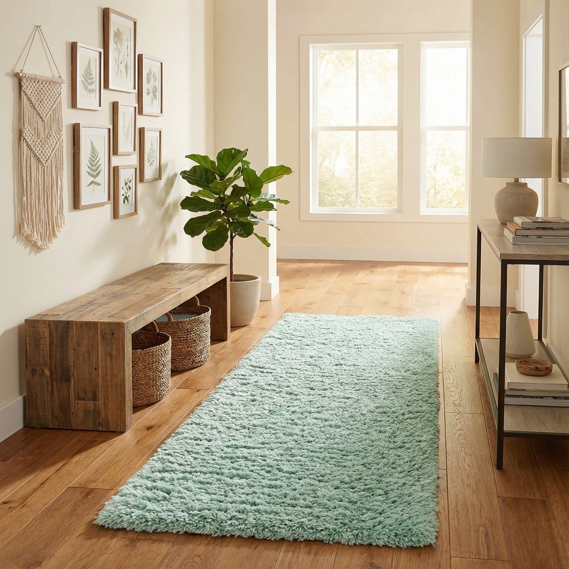 This runner brings color and texture to narrow spaces—place it in a hallway, alongside a bed, or in front of a vanity to soften hard floors. It pairs well with coastal and Scandinavian palettes, light wood tones, crisp whites, and pale pastels, and can also work as a bright, calming accent in contemporary or mid-century modern interiors.