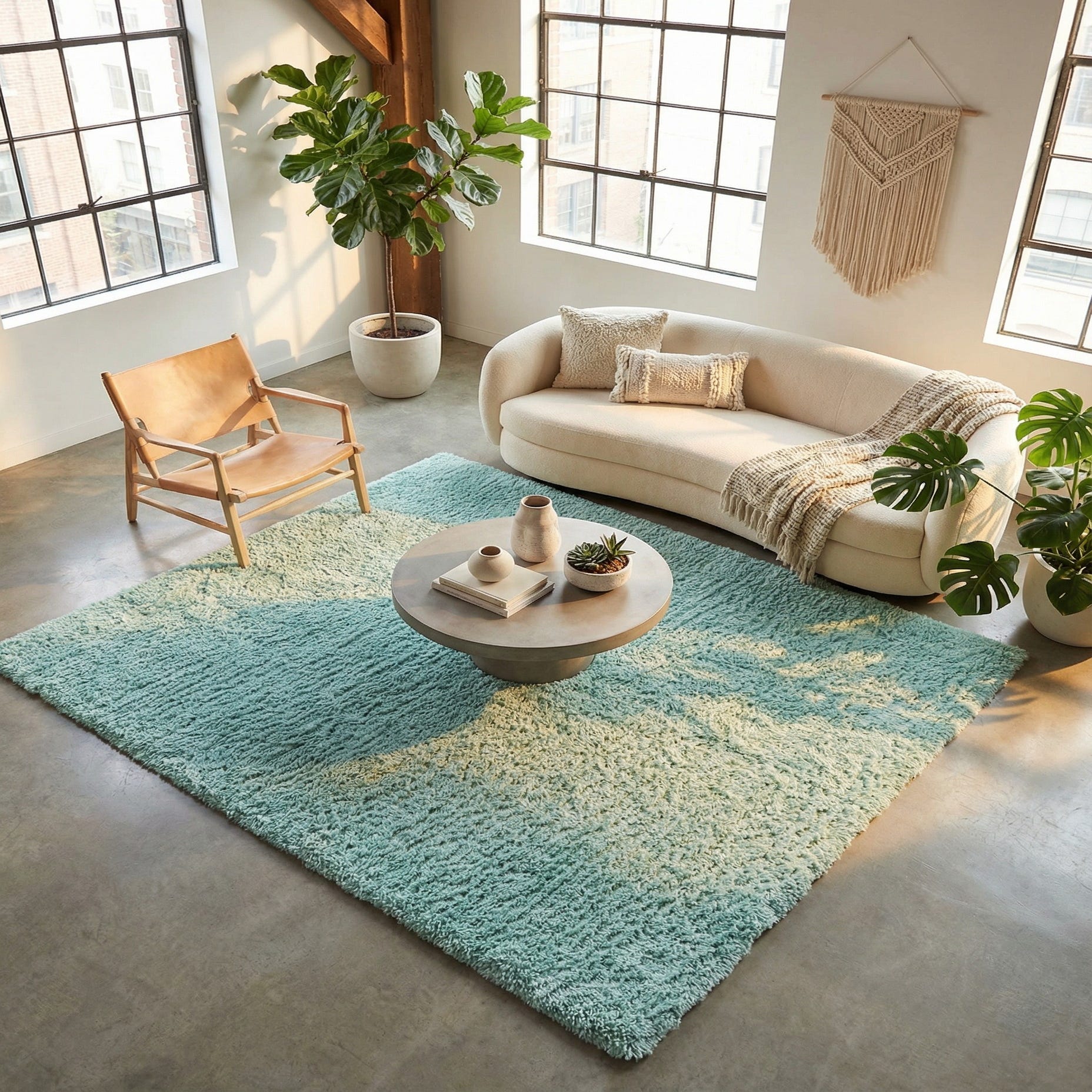 This rug works well in modern coastal, Scandinavian, or casual contemporary interiors, pairing naturally with light woods, white or sand-toned upholstery, and breezy linens. Use it beside a bed for a soft landing, under a low-profile seating group in a living room, or in a nursery or reading nook to introduce color and texture without competing with patterned decor. For layered styling, place it over a larger neutral foundation to add plushness and a pop of cyan.