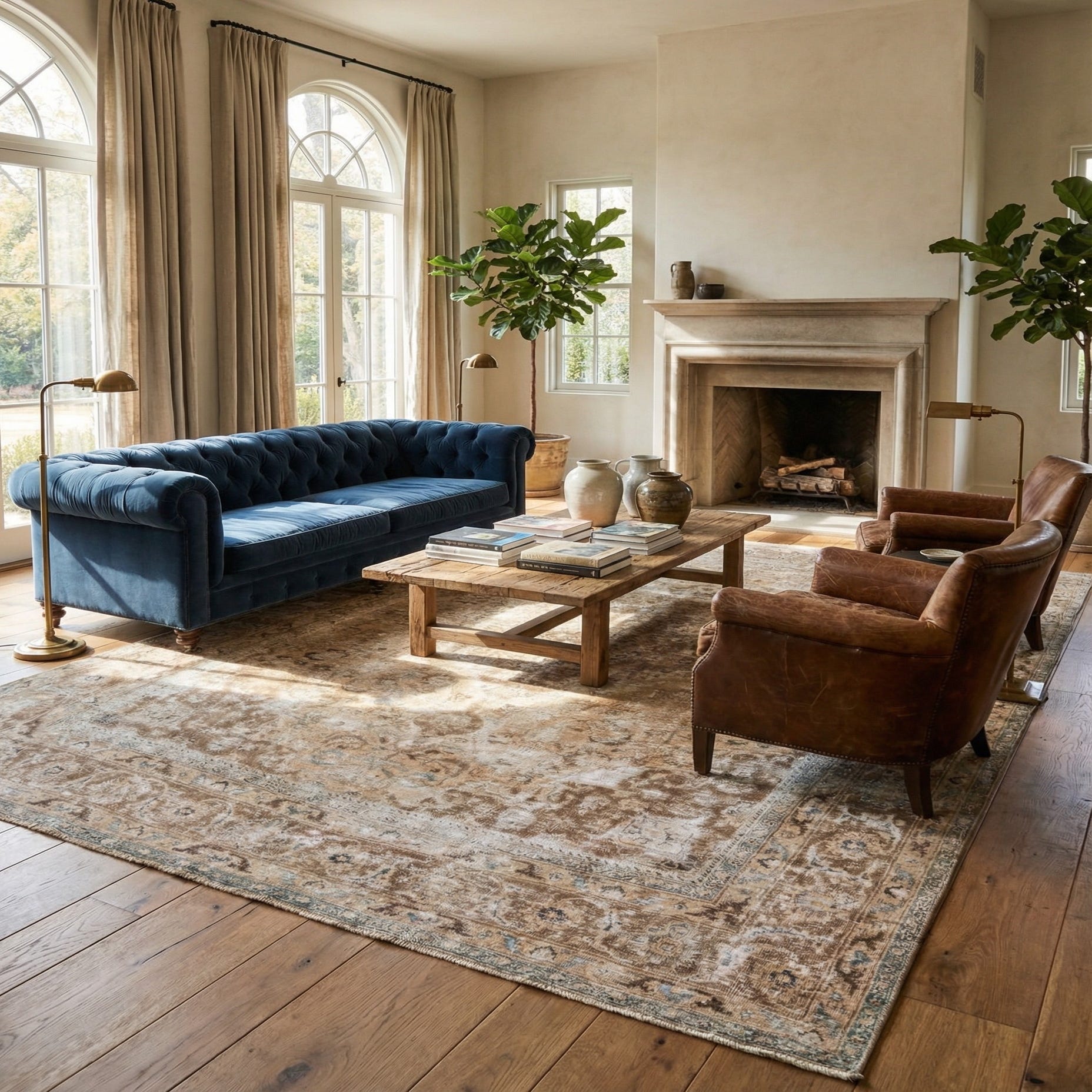 With its versatile color palette and timeless design, this rug would seamlessly integrate into a variety of interior design themes, from traditional to more contemporary spaces. It could serve as a refined foundation in a living room beneath a seating arrangement or stand as a statement piece in a dining area. The rich dark beige tones can complement both light and dark furniture, allowing for flexibility in coordinating with existing decor. The navy blue accents make it an excellent match for spaces incorporating blue elements or seeking a pop of color without overwhelming the room.