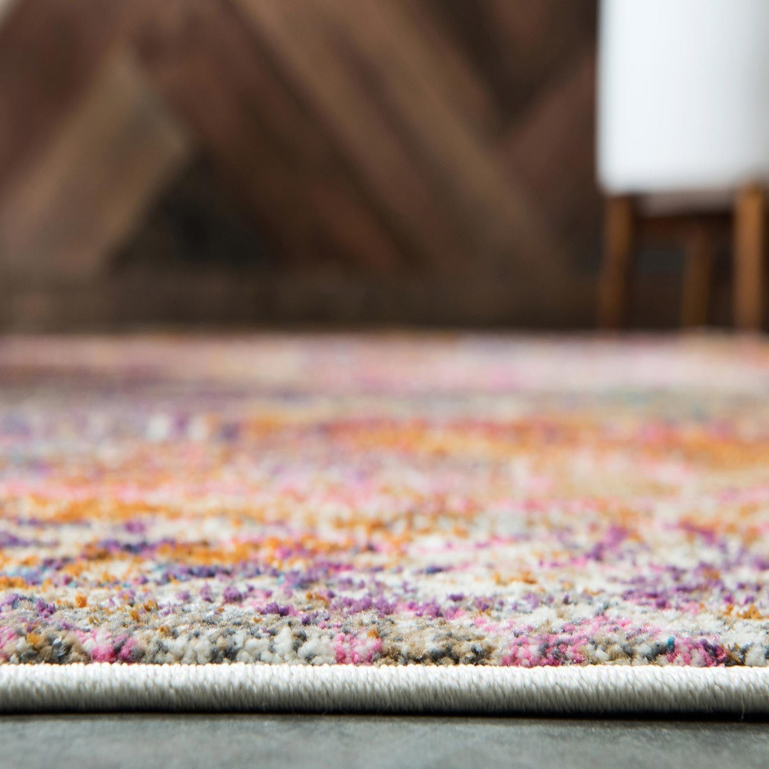 Pair this rug with warm wood tones and neutral upholstery to let its colors sing, or use it to introduce playful contrast in a minimalist living room through coordinated pillows and art. It works well layered beneath a seating group to anchor a large living space, under a bed to add color and texture to a master suite, or in an eclectic dining room paired with mixed-metal accents and woven chairs for a collected, lived-in look.