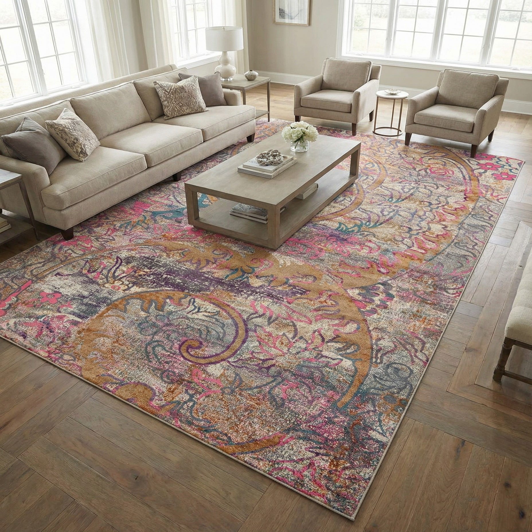 Pair this rug with warm wood tones and neutral upholstery to let its colors sing, or use it to introduce playful contrast in a minimalist living room through coordinated pillows and art. It works well layered beneath a seating group to anchor a large living space, under a bed to add color and texture to a master suite, or in an eclectic dining room paired with mixed-metal accents and woven chairs for a collected, lived-in look.