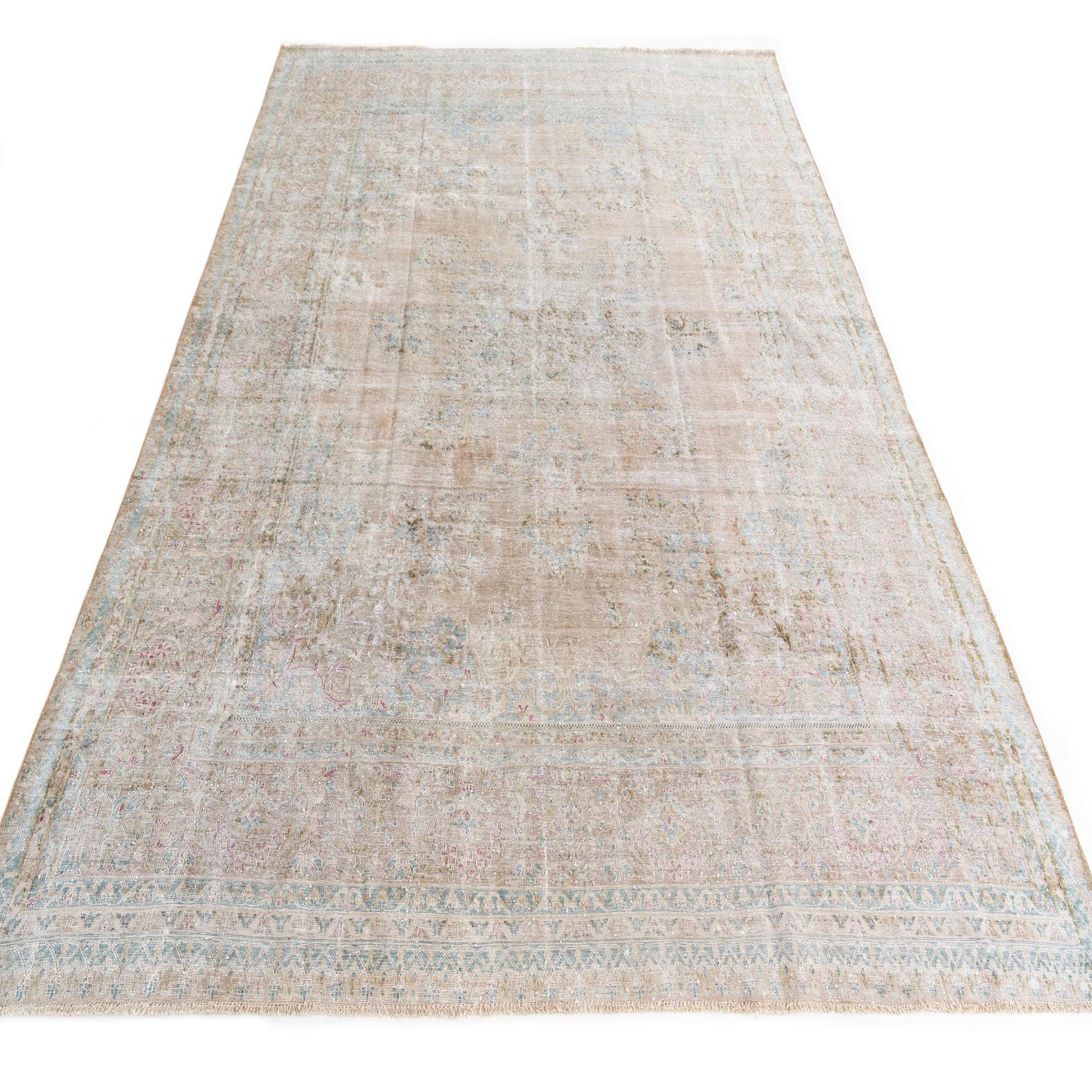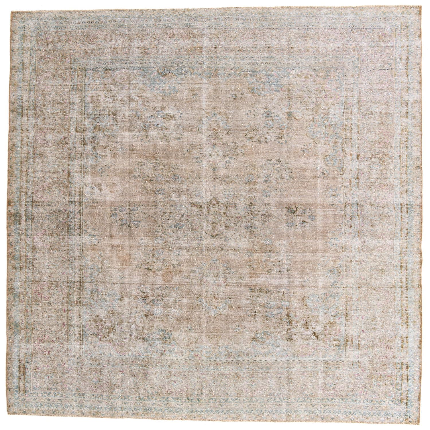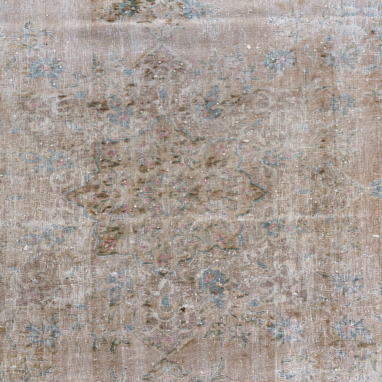A 10x13 rectangular indoor rug with a distressed Persian medallion pattern in muted browns, tans, and ivories.