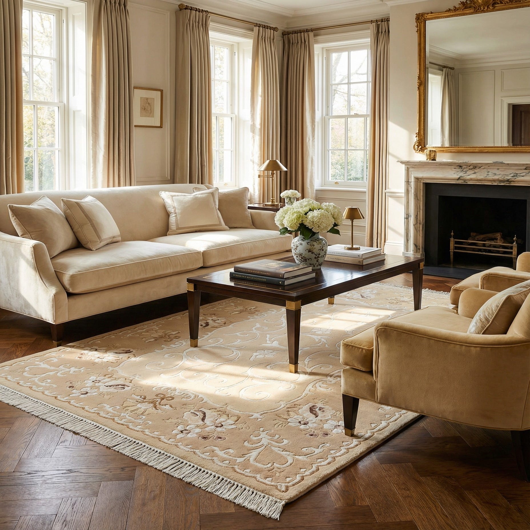 This rug is well-suited to spaces that draw on traditional or transitional decor themes, able to anchor a room with its balanced color scheme and striking yet subtle pattern. Ideal placements might include a living room, dining area, or bedroom, where its gentle colors harmonize with natural wood furnishings, plush upholstery, or neutral color schemes to create a cohesive and inviting atmosphere.