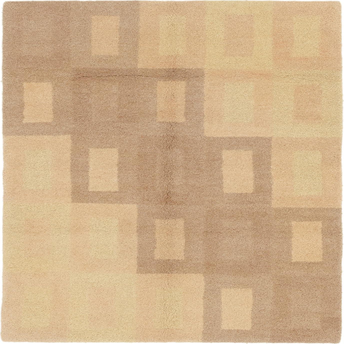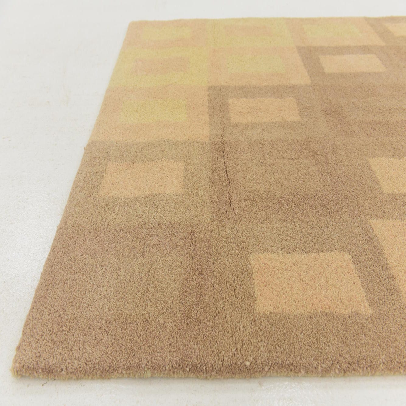 The Reproduction Gabbeh 4x6 area rug presents a contemporary geometric pattern, featuring an array of squares and rectangles that overlap in a block-like design. The color palette is a harmonious blend of Dark Beige, Brown, Cream, Light Brown, Tan, and Peach, with the dominant background in Dark Beige. Hand tufted from 100% wool, the rug offers a soft and inviting texture that provides both comfort and warmth.