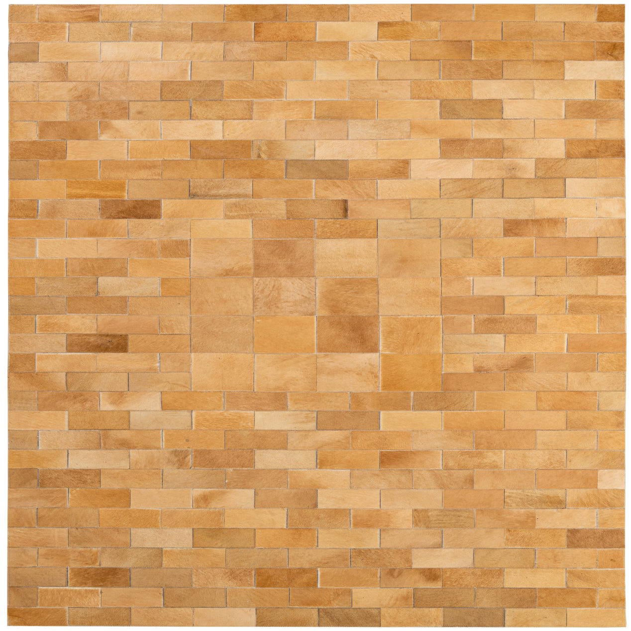 A 5x8 rectangular Cowhide Patchwork rug in varying shades of brown and tan, featuring a modern brick-like pattern.