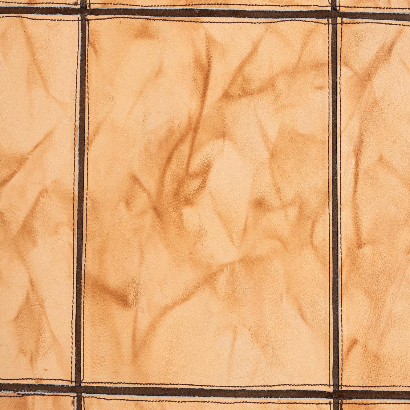 A 5x8 rectangular Cowhide Patchwork rug in varying shades of brown and tan, featuring a modern, abstract design.