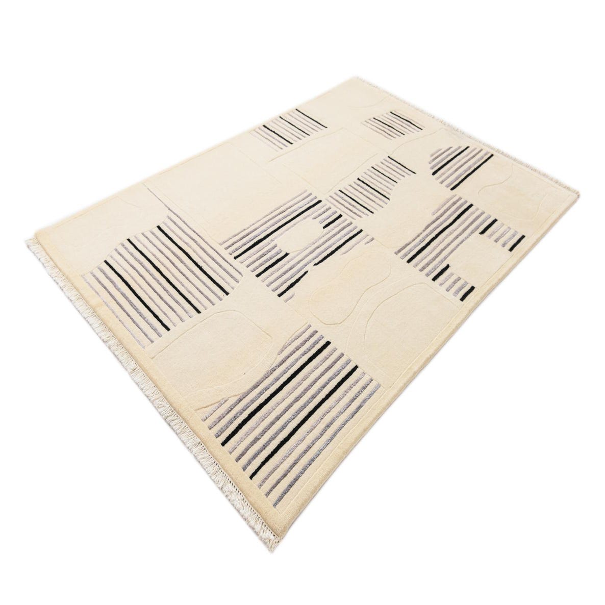 A 5x8 rectangular Darya rug with a modern abstract pattern in cream, tan, black, and gray, featuring vertical and horizontal stripes.