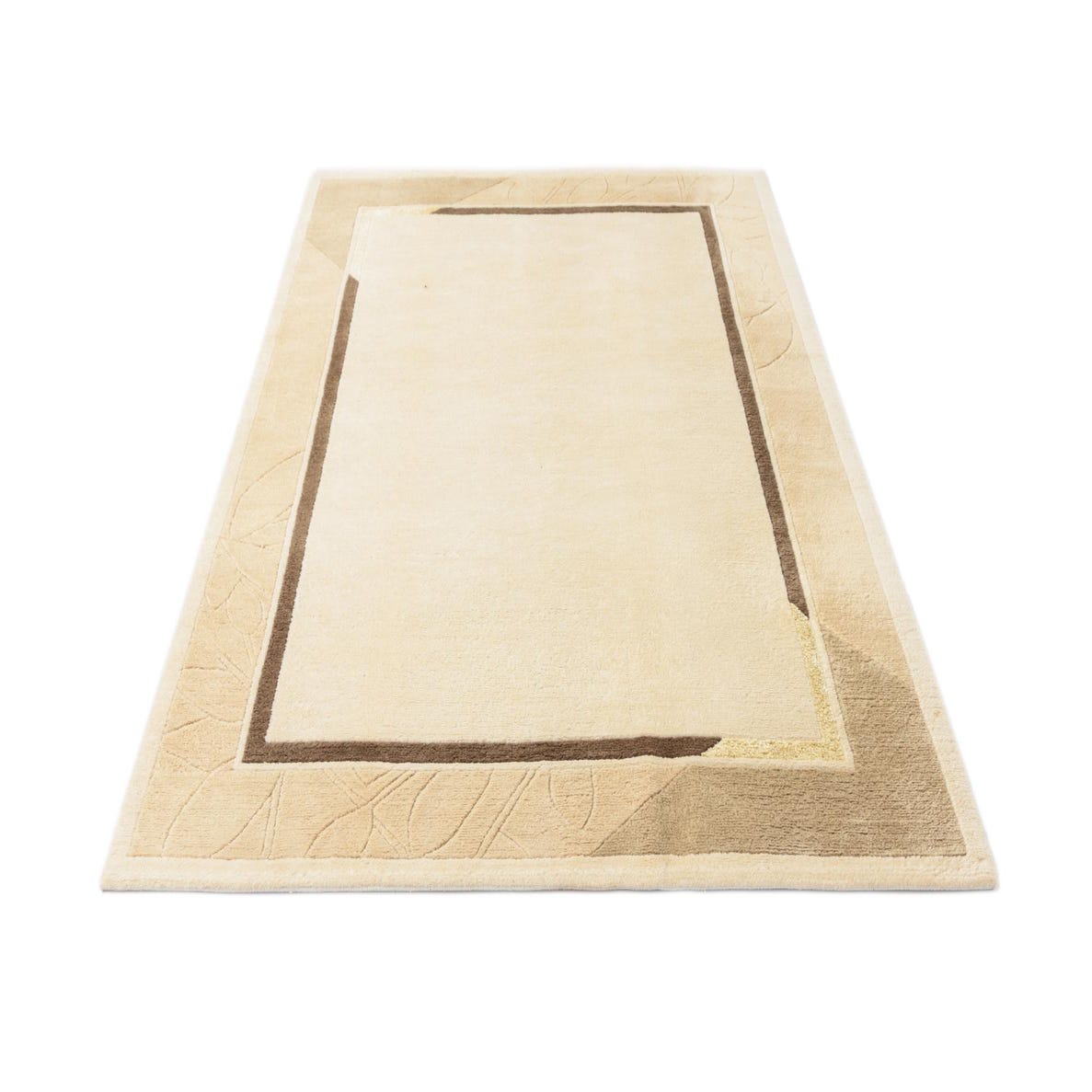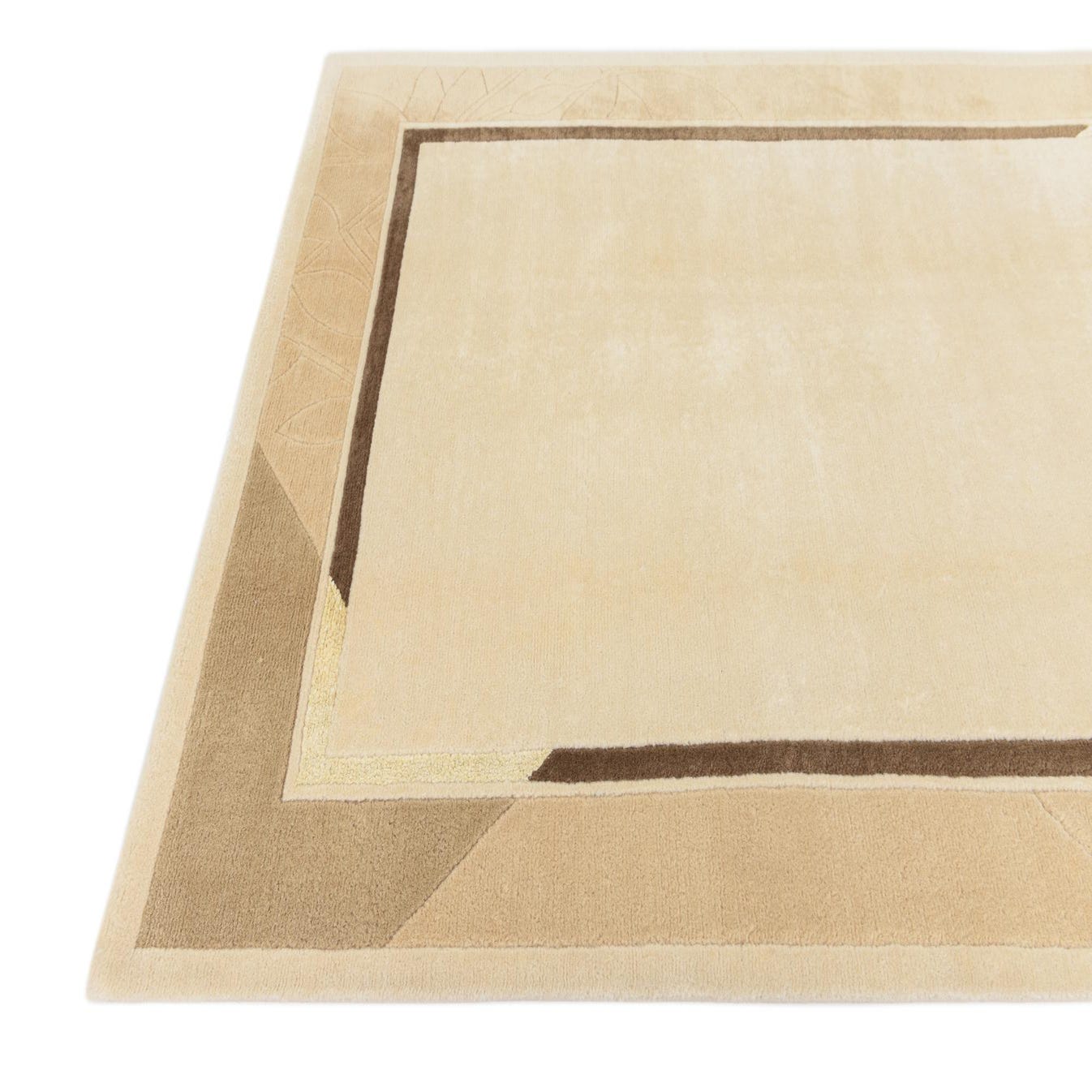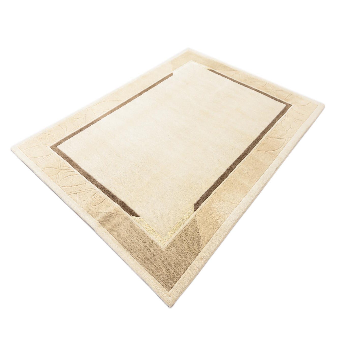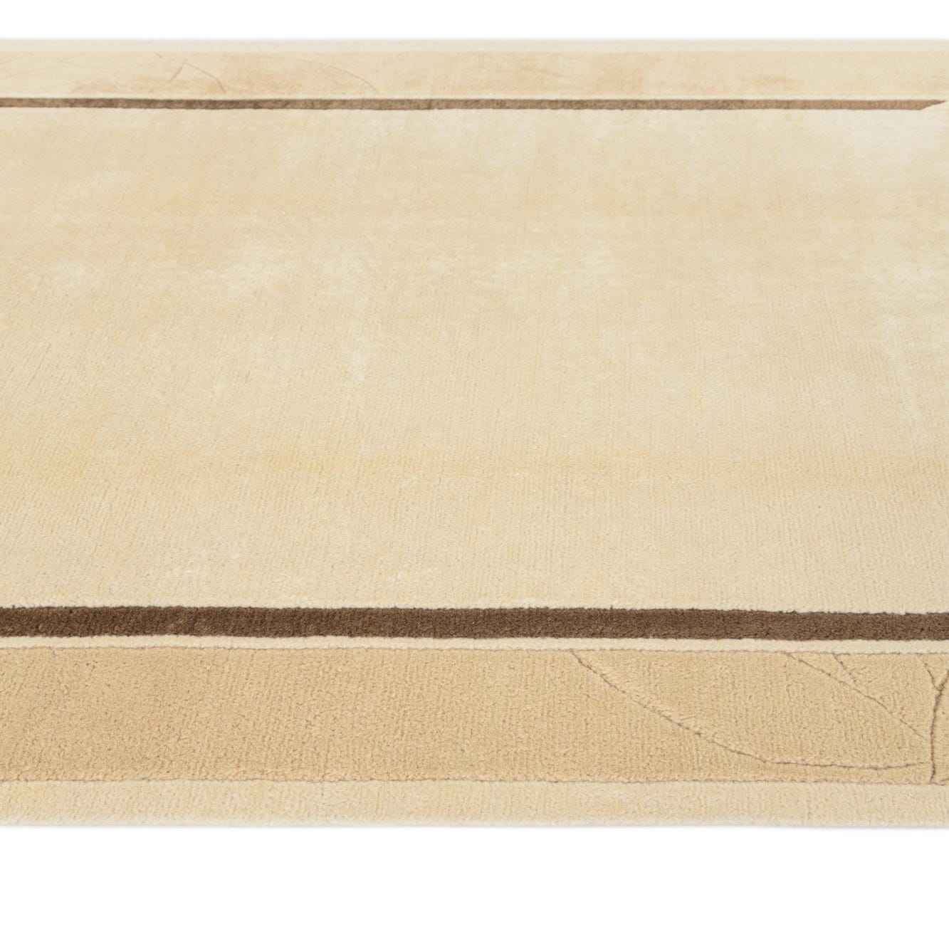 A hand-knotted, 100% wool rug with a restrained, layered border motif and subtle botanical carving. The dark beige background anchors a soft central field in tan and light brown, framed by a narrow brown inner stripe and angled corner accents. The outer border carries a low-relief leaf pattern that adds visual interest without dominating the design, giving the piece a quiet, transitional style that pairs classic structure with gentle organic detail.