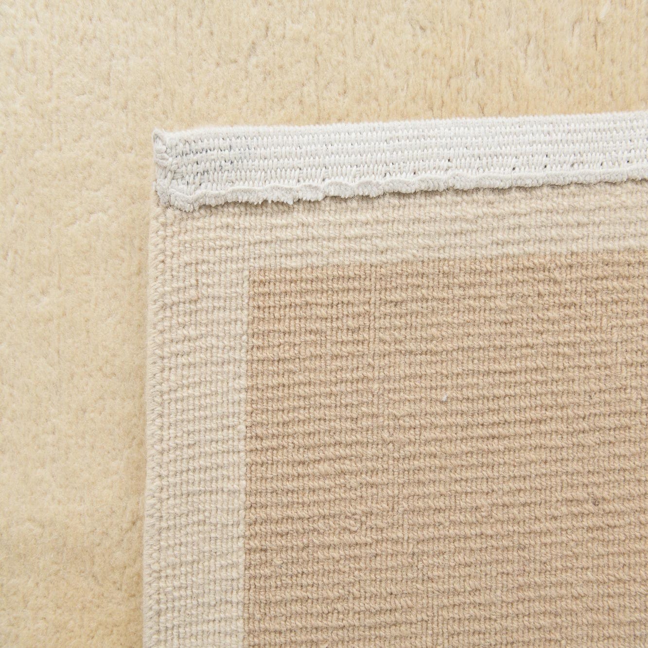 The wool pile feels warm and slightly plush underfoot, with the carved border providing a faint textural contrast you can both see and feel. Place it beneath a sofa and coffee table to define a living area, use it softened under a bed to add warmth to a bedroom, or center it in a small dining nook to ground warm wood furniture. It coordinates well with natural wood tones, neutral upholstery, and layered textiles in creams, browns, or muted greens for a calm, cohesive interior.