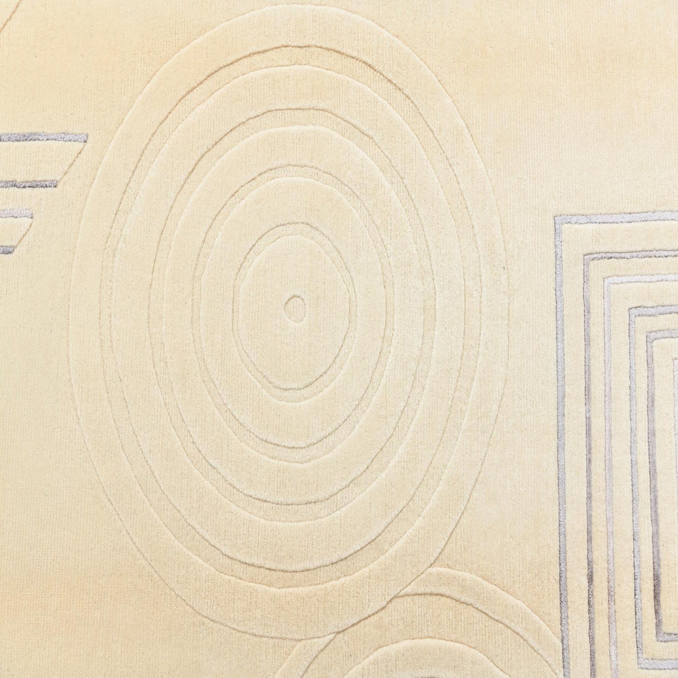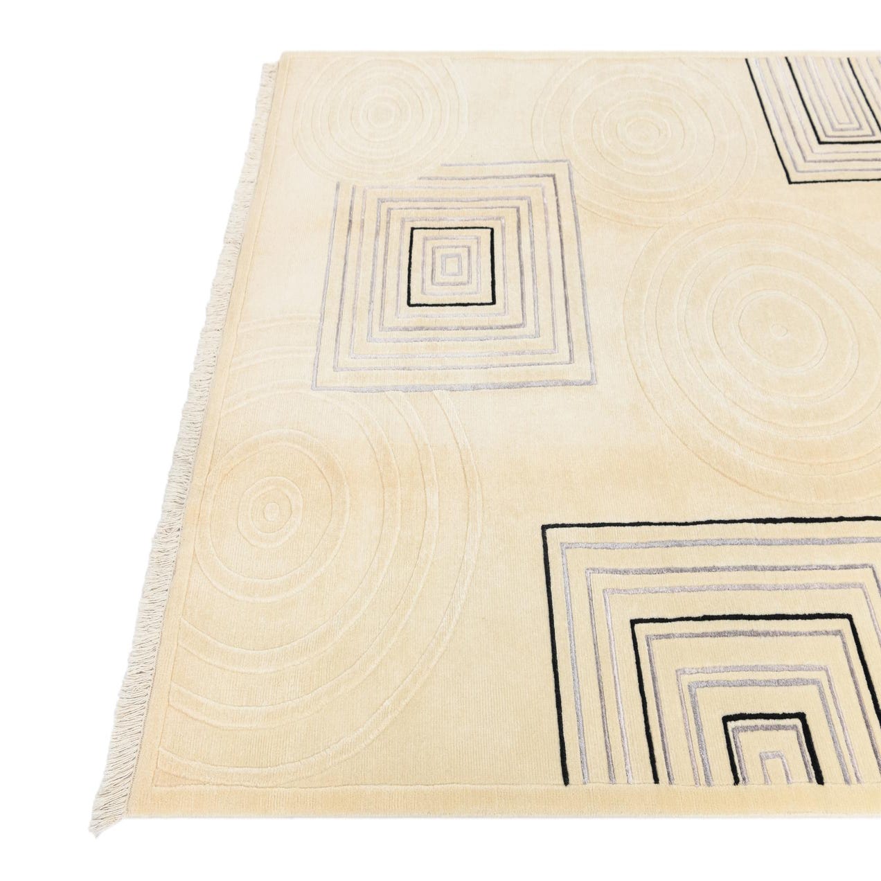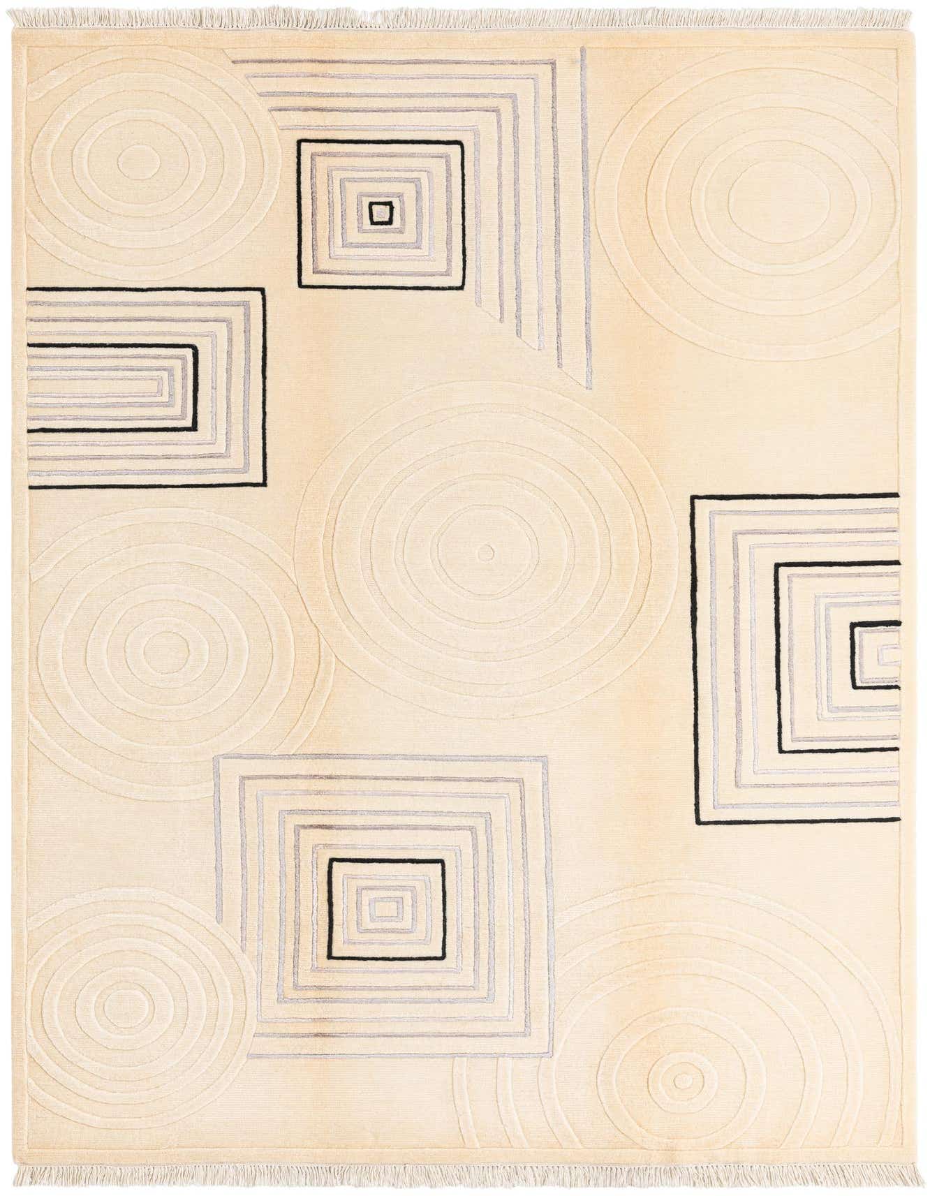 A 5x8 rectangular Darya rug with a modern geometric pattern of concentric circles and squares in cream, brown, and gray.