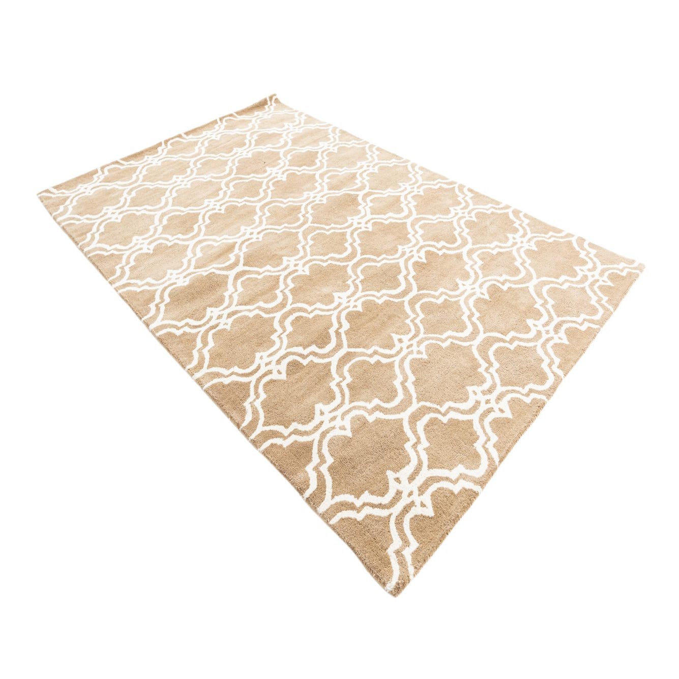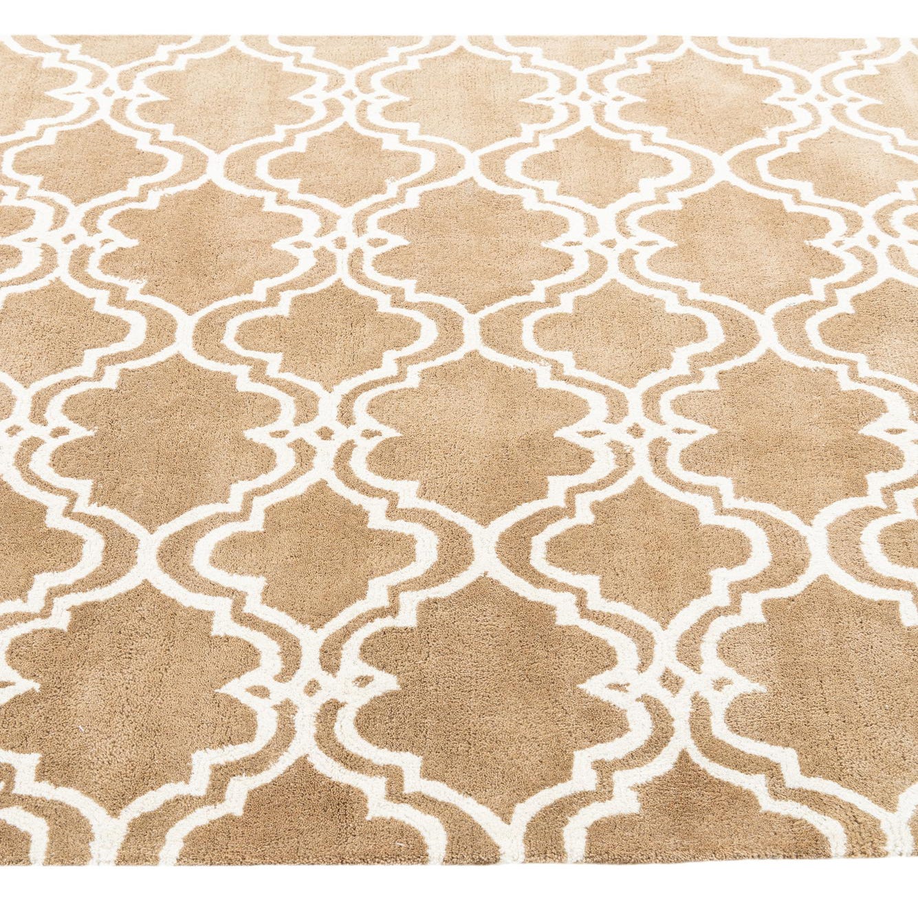 The Luna Collection presents a 5x8 rug meticulously hand-tufted from a blend of wool and cotton, designed to deliver both durability and comfort underfoot. This rug exhibits a harmonious pattern of repeating shapes reminiscent of traditional Moroccan motifs. The combination of dark beige and ivory colors is versatile and lends itself to a variety of décor styles. Its earthy dark beige background is upbeat and welcoming, while the ivory detailing provides a crisp contrast, enhancing the visual interest of the piece.