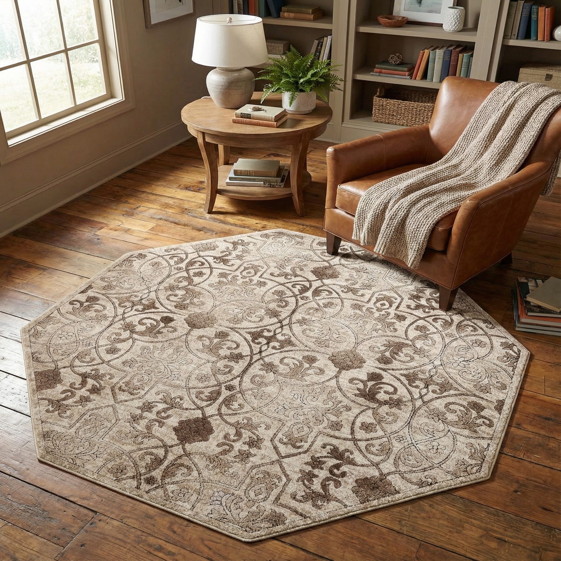 An octagonal rug with a classic arabesque and floral lattice pattern rendered in rich, warm neutrals. The background color is Dark Beige, with decorative motifs worked in Beige, Brown, and Cream to create a layered, vintage-inspired look. Machine made from 55% polypropylene and 45% polyester, the rug has a low, even pile that feels smooth underfoot and offers gentle tactile variation where the pattern is defined.