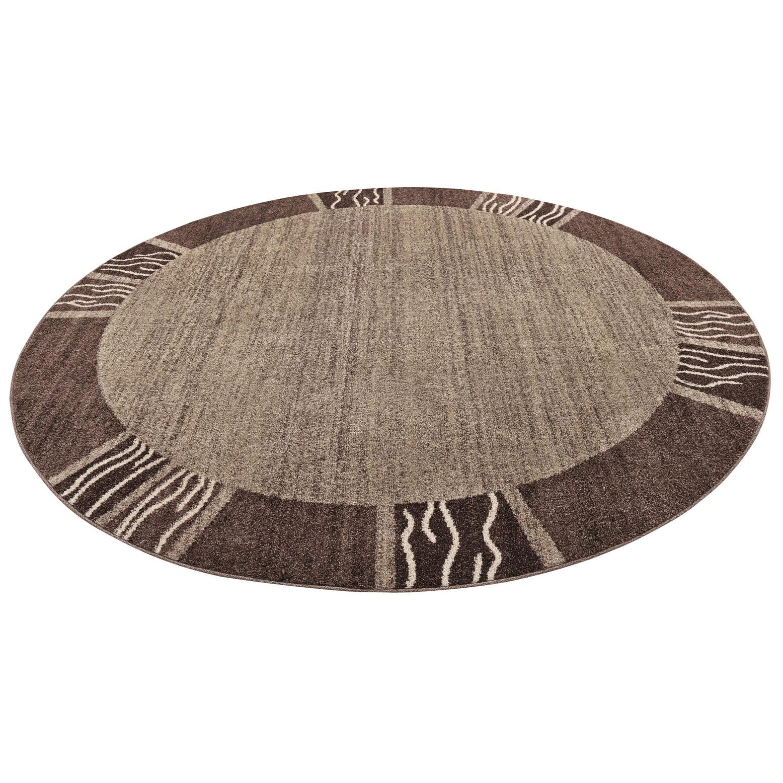 A round 7' 10" brown rug with a wide dark brown border featuring ivory wavy stripe patterns, ideal for a living room.