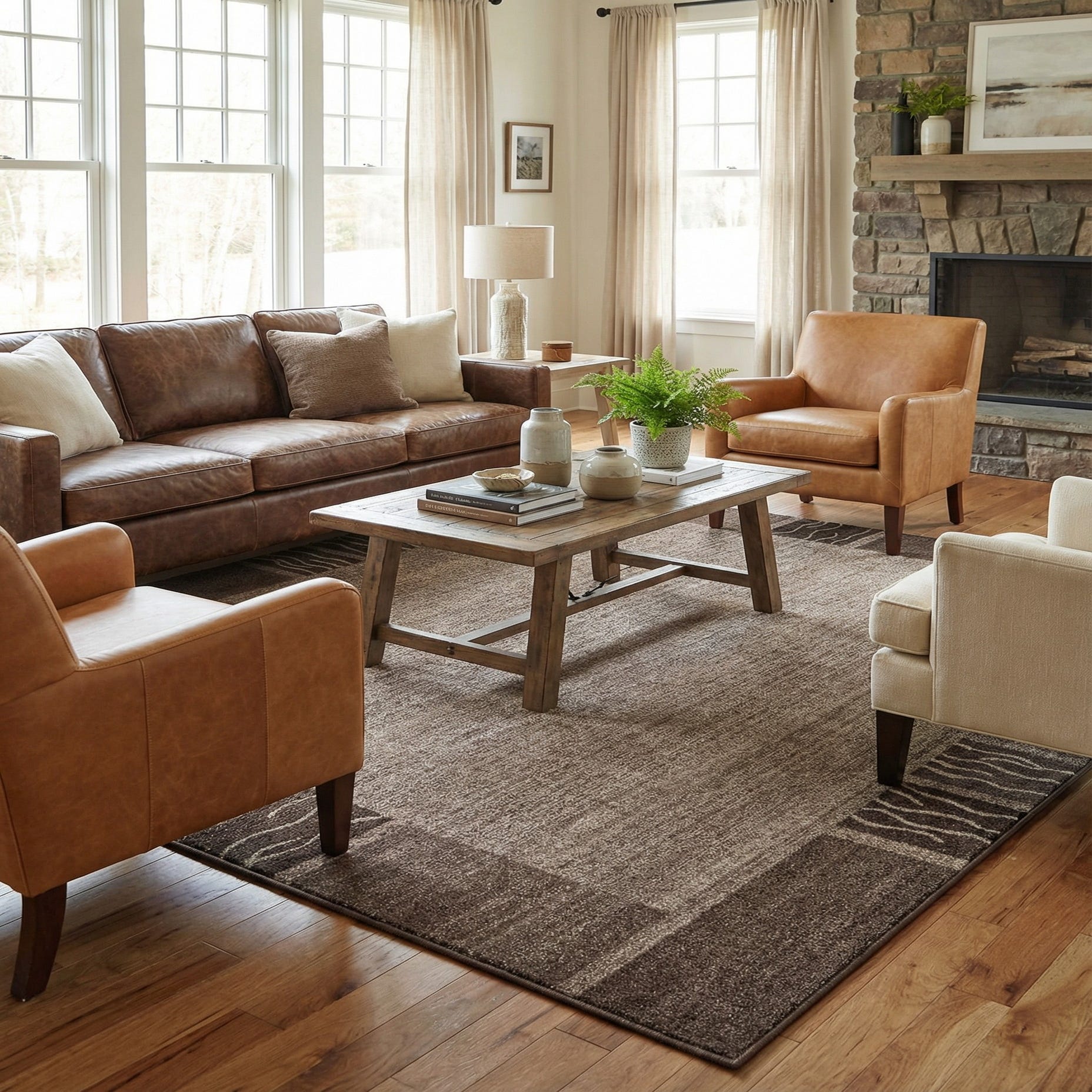 A subtle gradient motif creates a sense of depth and movement, while linear accents in a contrasting brown tone add a touch of visual interest without overwhelming the design. The versatility of the Angelica rug's neutral color scheme and understated pattern allows for seamless integration into a variety of interior design themes, from contemporary city dwellings to cozy suburban homes.