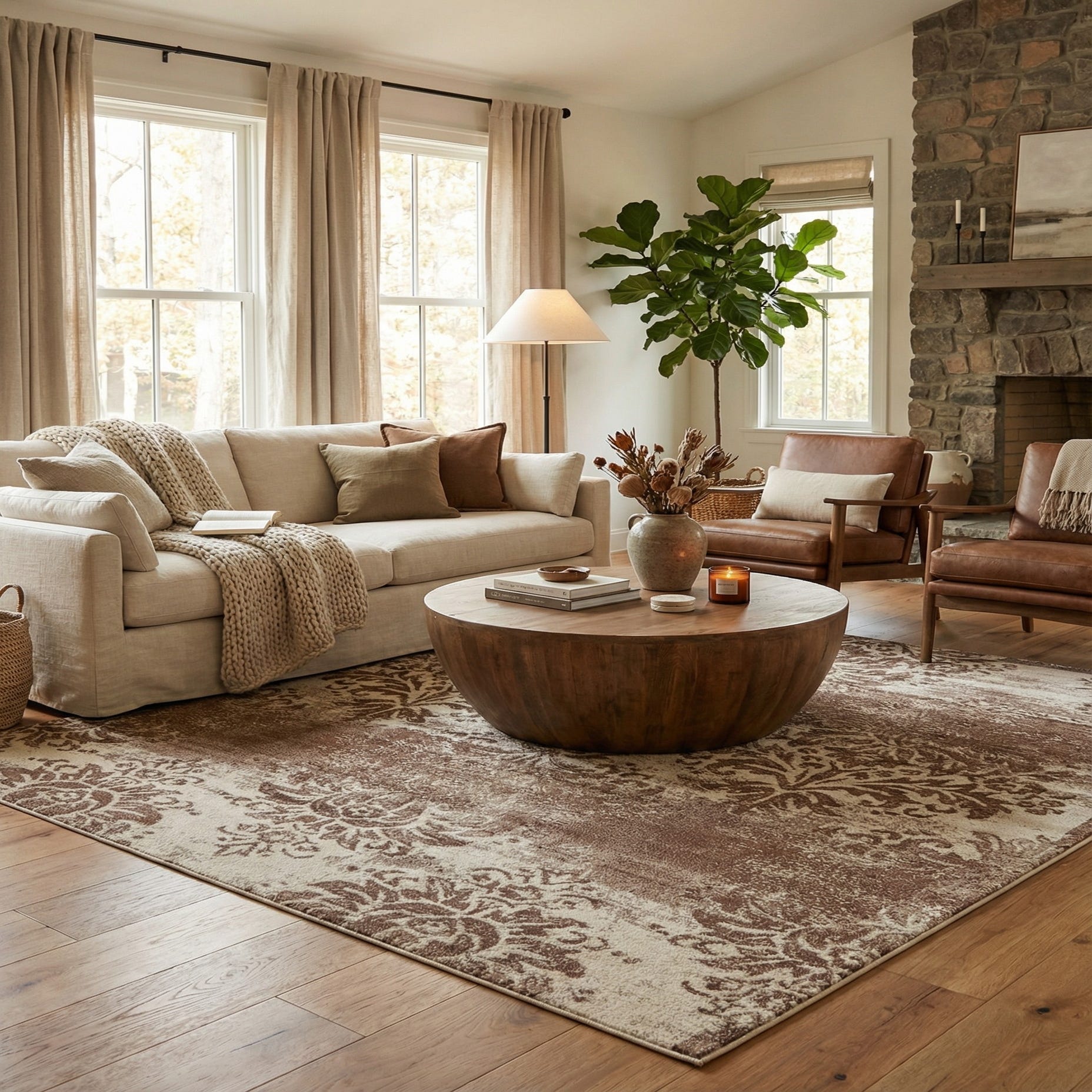 Machine-made from 55% polypropylene and 45% polyester, the construction provides consistent pattern definition and a pliable feel underfoot. This palette and pattern pair naturally with warm wood tones, leather seating, or neutral upholstery—use it to anchor a living room seating group, layer it beneath a dining table, or add warmth and texture to a bedroom. The rug works well in traditional and transitional settings and can also soften a more contemporary space that needs a touch of pattern.