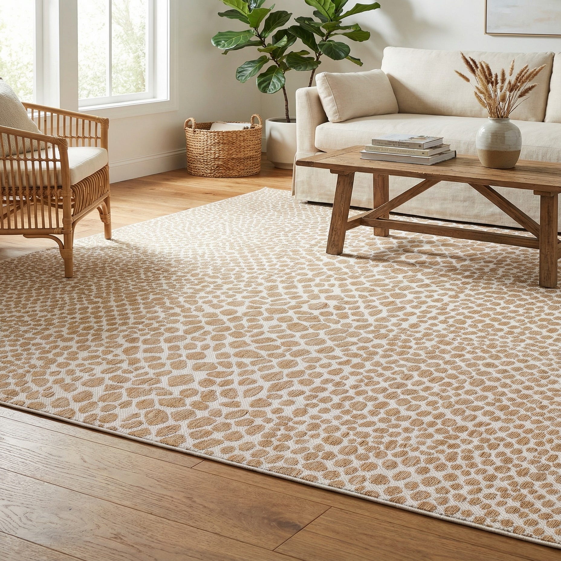 Dark Beige provides a warm, grounded field for an organic pebble motif rendered in Ivory. The pattern moves from tightly clustered small shapes at the edges to larger, irregular ovals toward the center, creating subtle visual motion without strong contrast. Machine-made from 100% polypropylene, the rug has a low-profile, tightly woven feel that is smooth underfoot with a slight textural distinction where the Ivory pattern sits against the Dark Beige background.