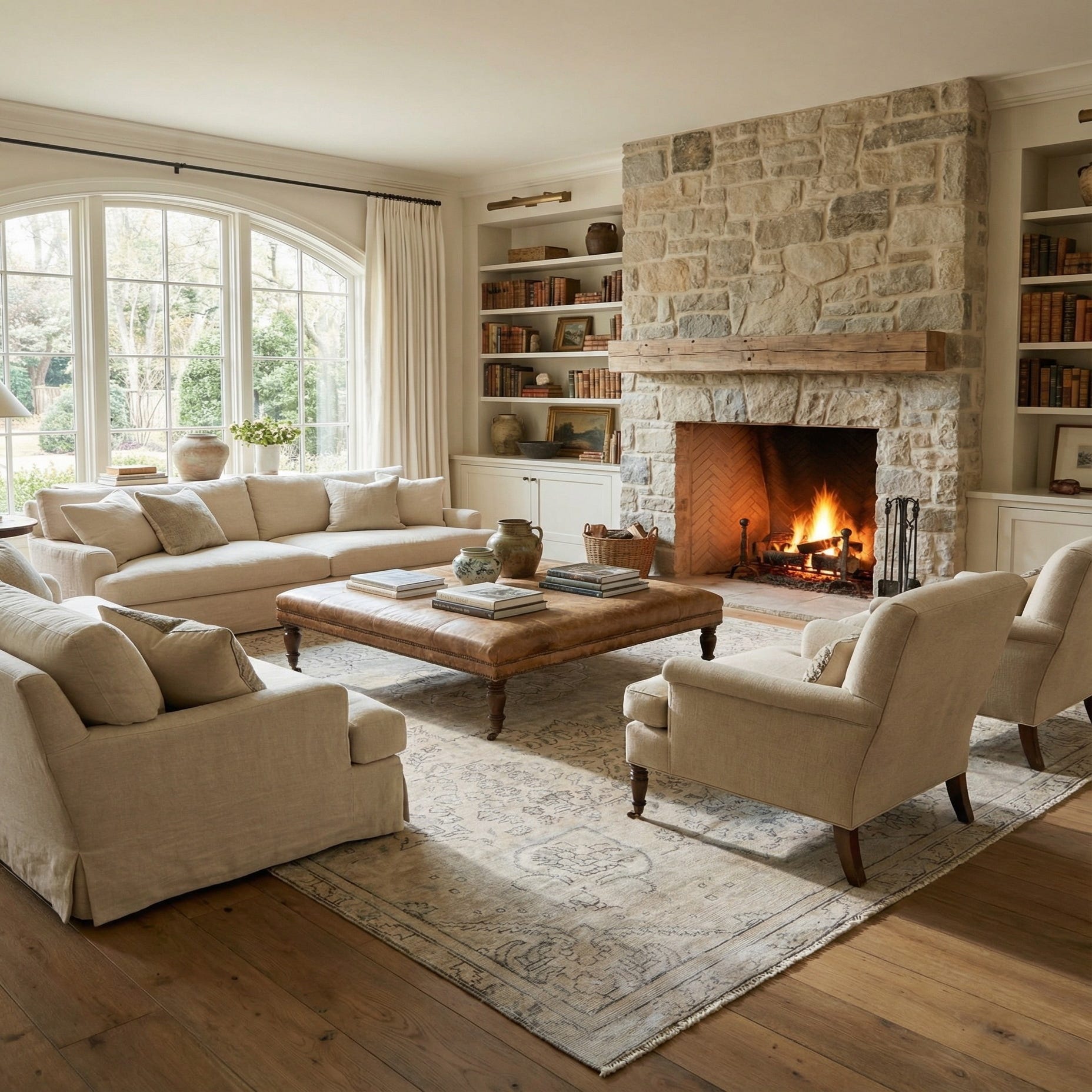 The piece is finished with fringe detailing, adding an additional element of textural interest and enhancing its classic appeal. This rug would complement interiors that embrace a mix of antique and modern furnishings, making it suitable for transitional, contemporary, or traditional settings. Its neutral color scheme allows it to serve as a unifying element in a living room, dining area, or bedroom, providing a foundation that supports a variety of decor choices.