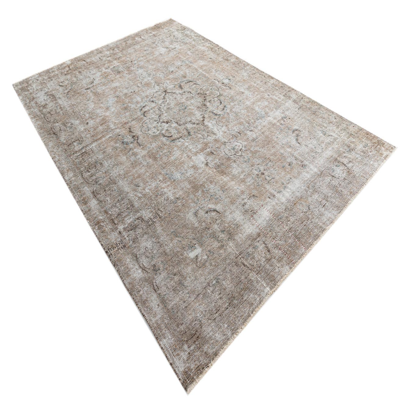 A large 8x11 rectangular Ultra Vintage wool rug in shades of brown, tan, and cream, featuring a distressed Persian medallion pattern.