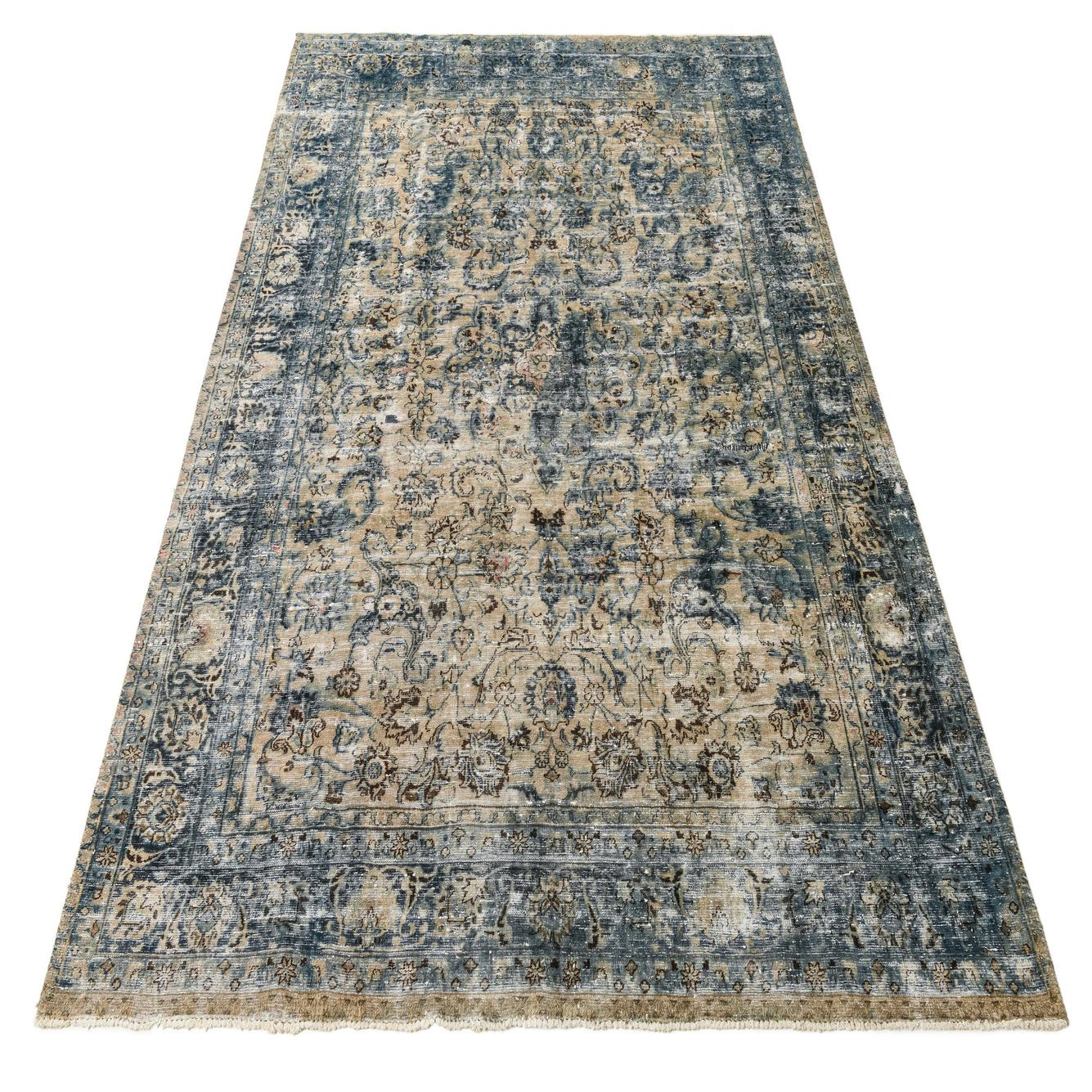 This Persian Ultra Vintage rug is an antique Persian Rug that has been washed, over-dyed, and then shaved down to a low pile. Look at the detail pictures to fully appreciate the uniqueness of this piece.
