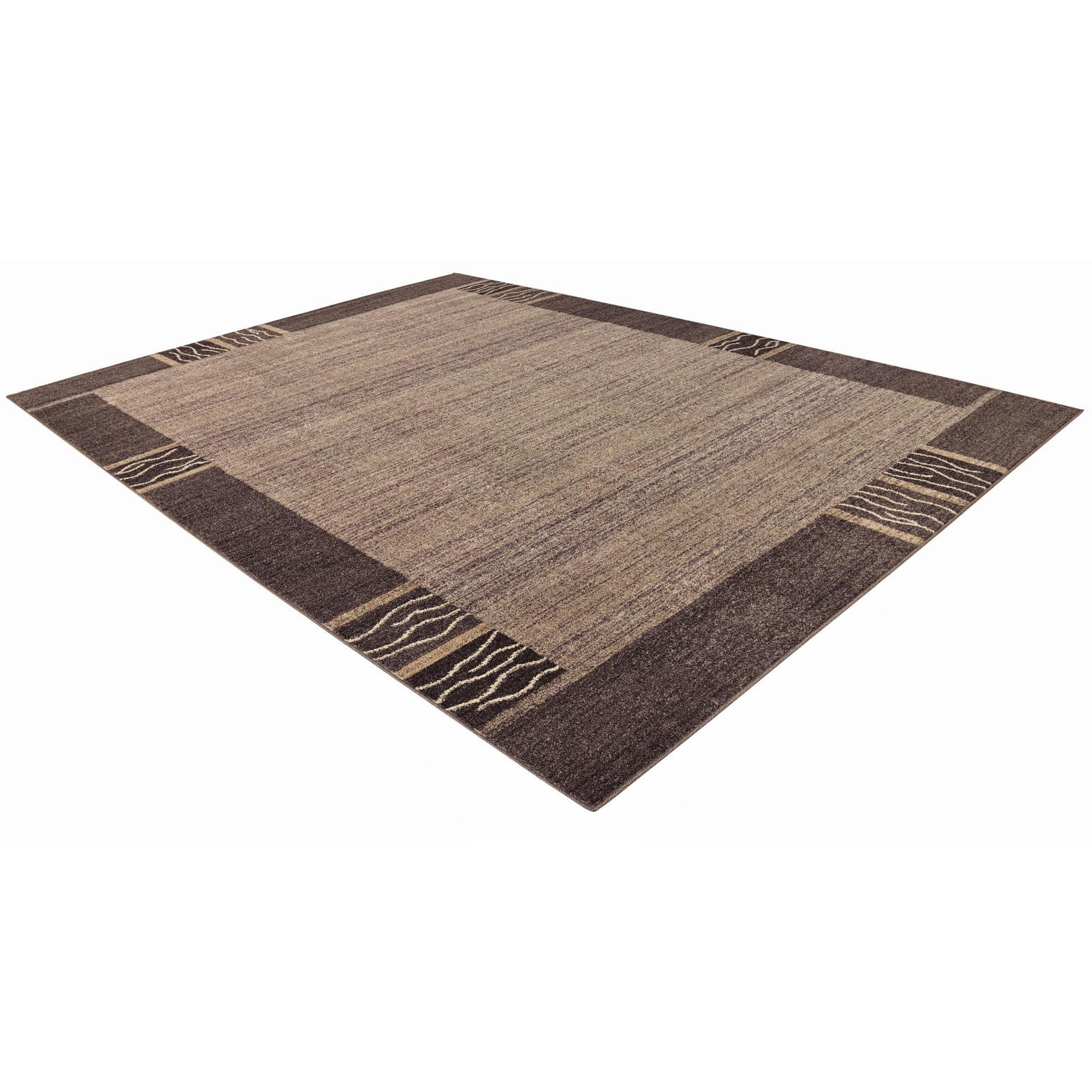 A 9x12 rectangular Angelica rug in varying shades of brown and tan, featuring a striped center and a dark border with wavy ivory patterns.