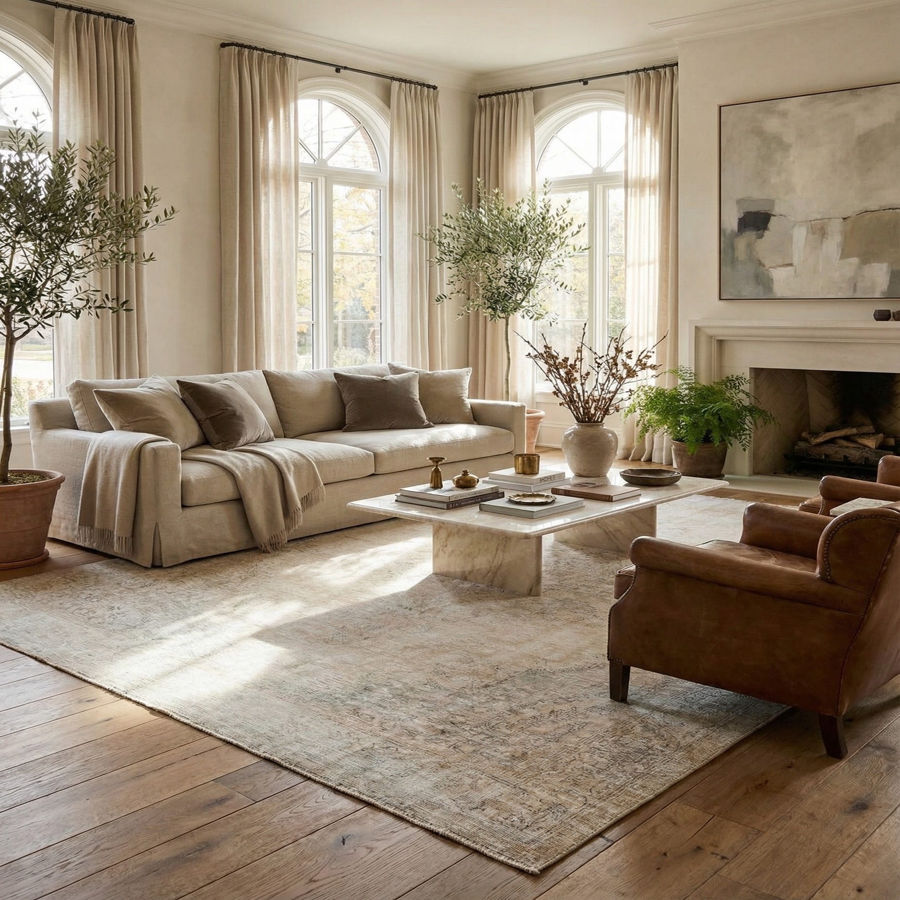 A 9x12 rectangular Ultra Vintage wool rug with a faded Persian pattern in browns, tans, and creams.
