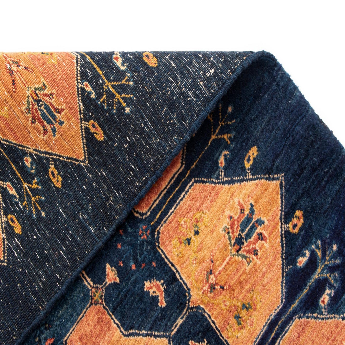 The Luribaft collection presents a 10 ft runner handcrafted from 100% wool, demonstrating the durability and natural comfort of its construction. This runner features a compelling geometric pattern characterized by hexagonal motifs and botanical designs that nod to traditional craftsmanship. The juxtaposition of dark blue against vibrant splashes of orange, green, and yellow imbues this piece with a dynamic visual appeal, while the dark blue background ensures the colors stand out with striking clarity.