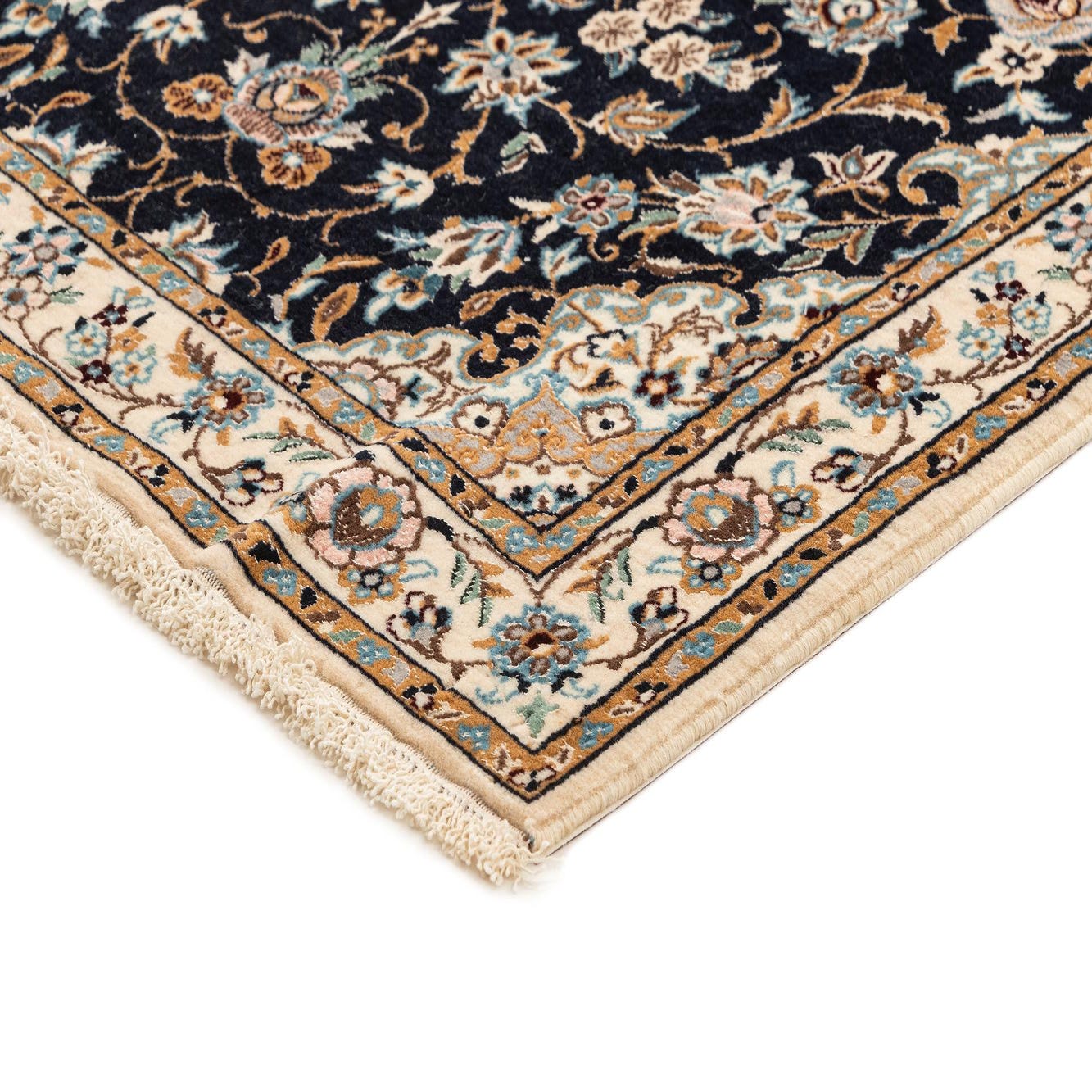 Hand-knotted of wool, this runner presents a traditional Persian-inspired medallion layout on a deep dark blue background. Repeating central medallions anchor a field of scrolling floral vines and rosettes, while an ivory-beige guard border frames the composition and introduces soft accents of light blue, tan and muted rose. The detailed knotting creates crisp outlines and layered motifs that read clearly across the length of the piece, finished with short fringes at each end.