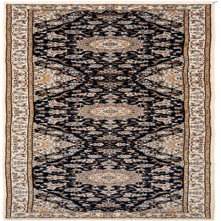 The wool pile feels dense and pleasantly soft underfoot, with a modest nap that gives the motifs a subtle dimensionality when you run your hand over it. Its palette and pattern work well in classic and transitional interiors — place it in a long entryway or hallway to guide circulation, lay it beside a bed for a warm, layered look, or use it to define a narrow kitchen or gallery corridor. Pair with warm wood floors, ivory upholstery, or brass and matte black accents to complement the dark blue field and the rug’s lighter border tones.