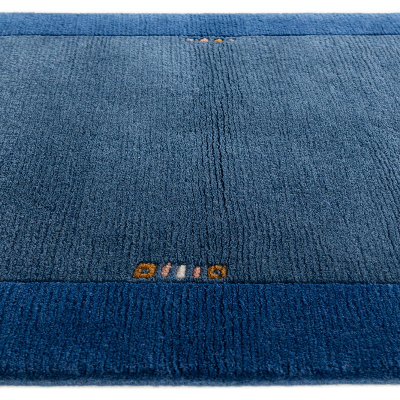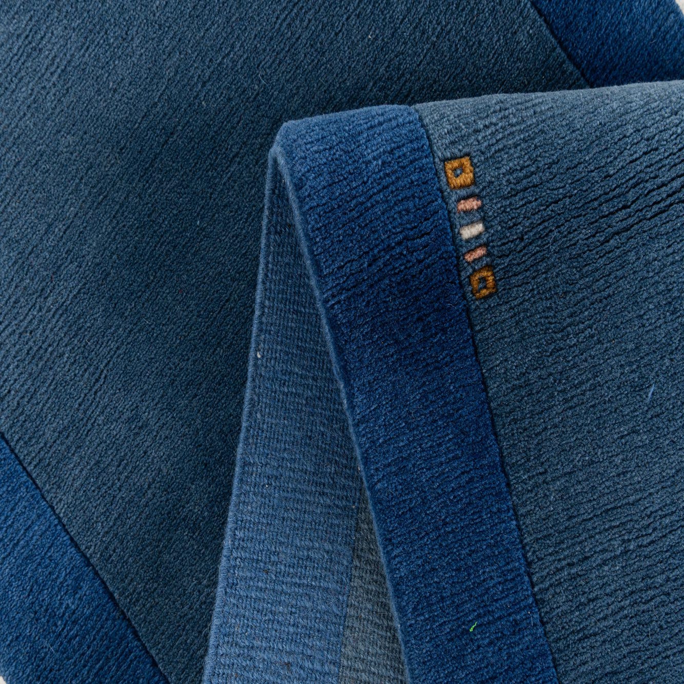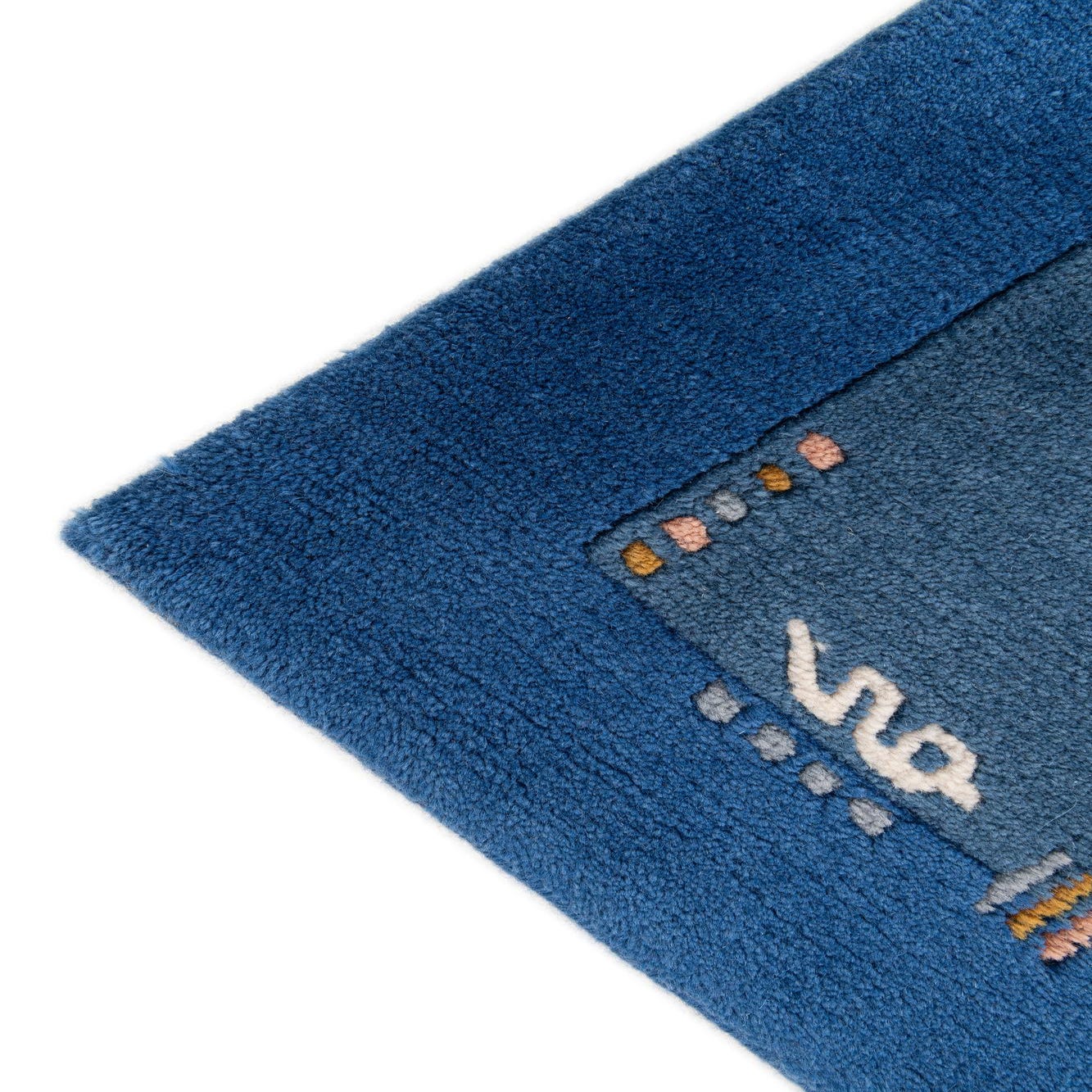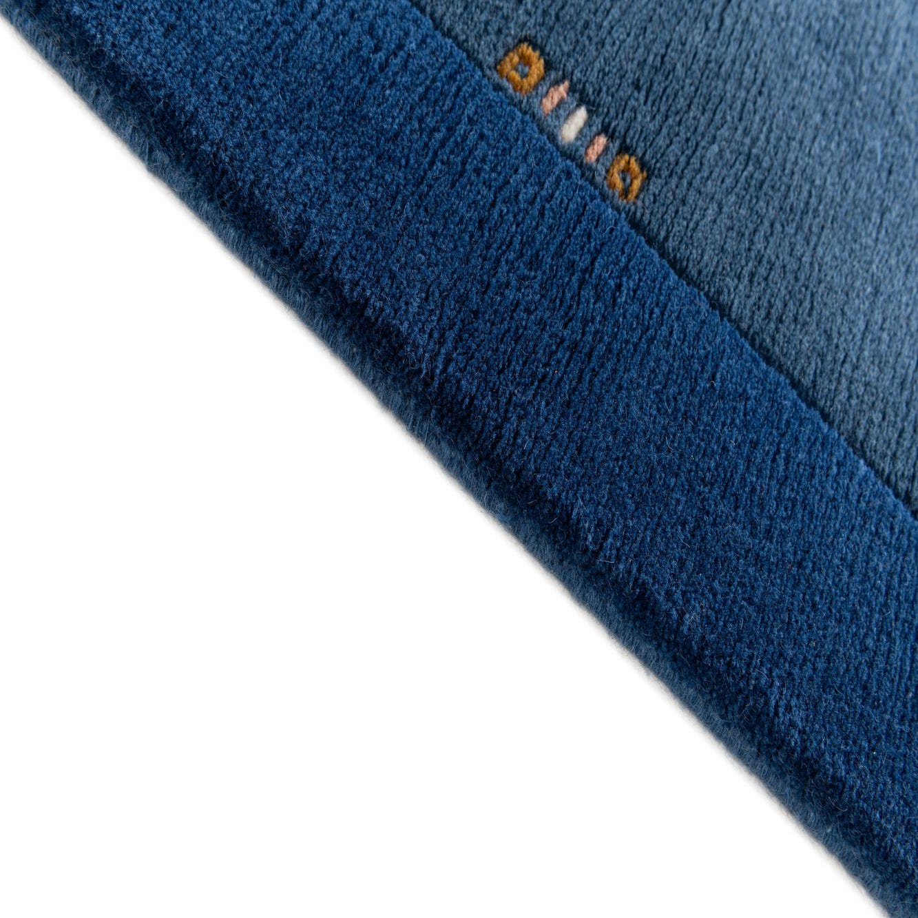A 10 ft blue wool runner rug with a darker blue center and a lighter blue border featuring subtle, abstract, light-colored patterns.