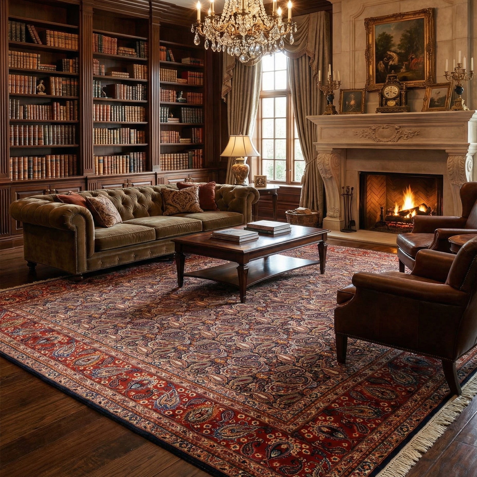 A 10x13 rectangular Persian wool rug featuring a dense blue paisley pattern with a rich red border.