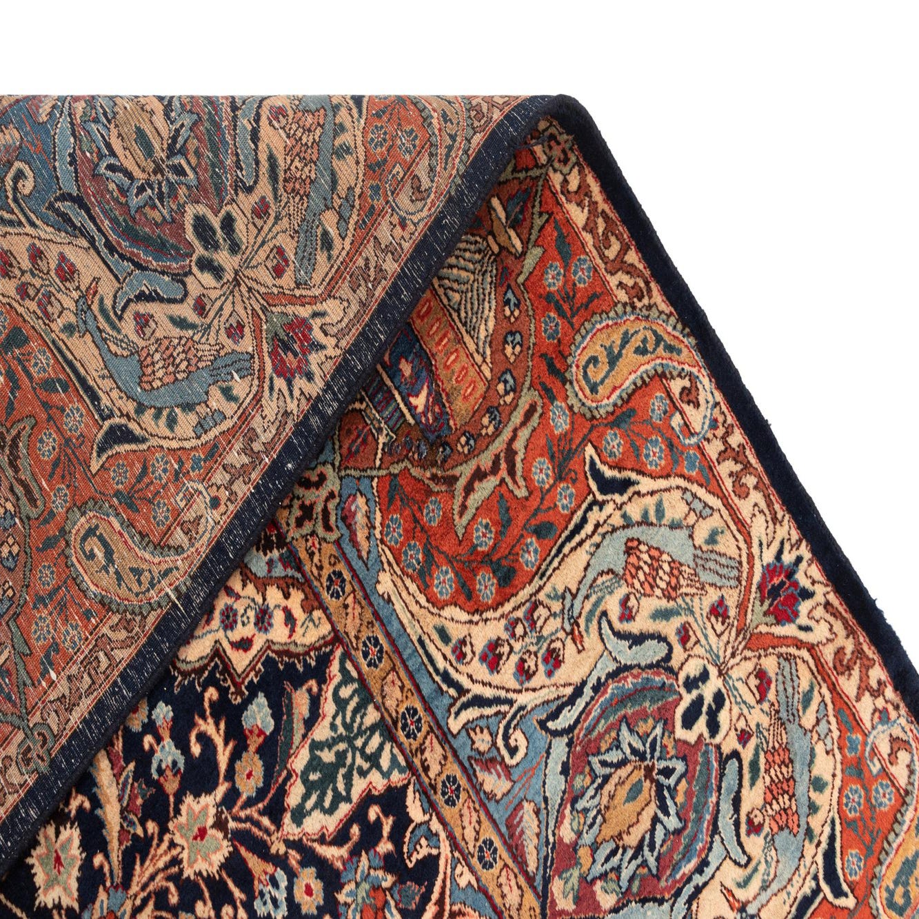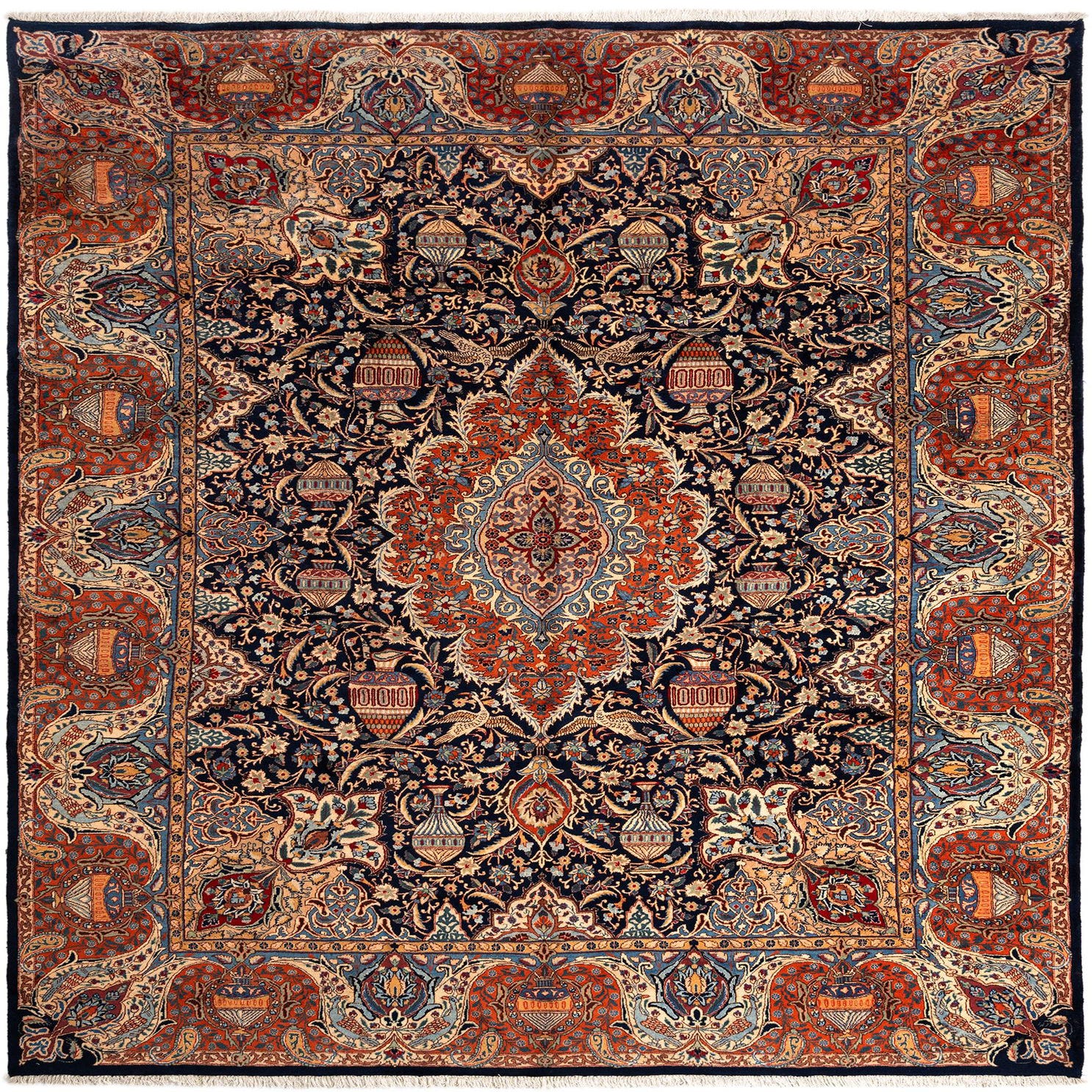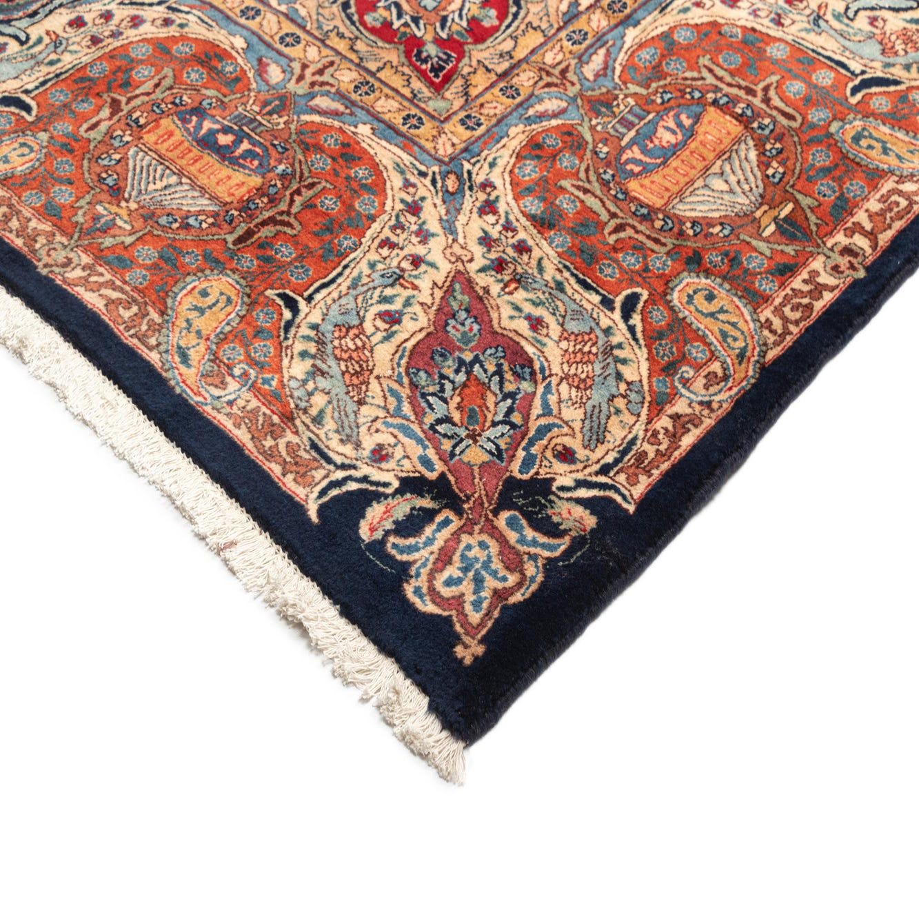 The Kashmar collection presents a meticulously handcrafted 10x13 rug made from 100% wool, offering both durability and comfort underfoot. The rich dark blue background sets a profound stage for the intricate pattern work that adorns the rug's surface. This piece features an array of symmetrical, ornate motifs, including stylized florals and traditional Persian medallions that are enhanced by a diverse color palette of brown, orange, blue, violet, red, cream, and green. The detailed borders echo the central theme, providing a coherent visual frame to the elaborate design.