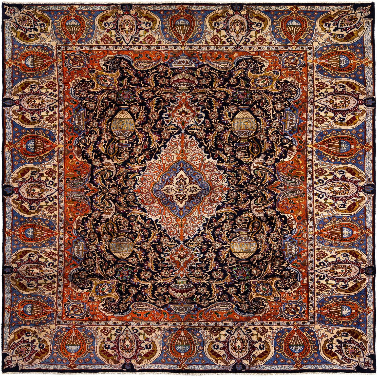 This Kashmar collection rug is a hand-made piece crafted from 100% wool, offering a luxurious and durable textile underfoot. It features a complex and intricate pattern that includes a multitude of design elements, from florals to arabesques to palmettes, all harmoniously integrated to create a captivating visual landscape. Measuring 10x13, this rug boasts a rich color palette set against a dark blue background, with additional colors including cream, orange, blue, red, brown, and green.