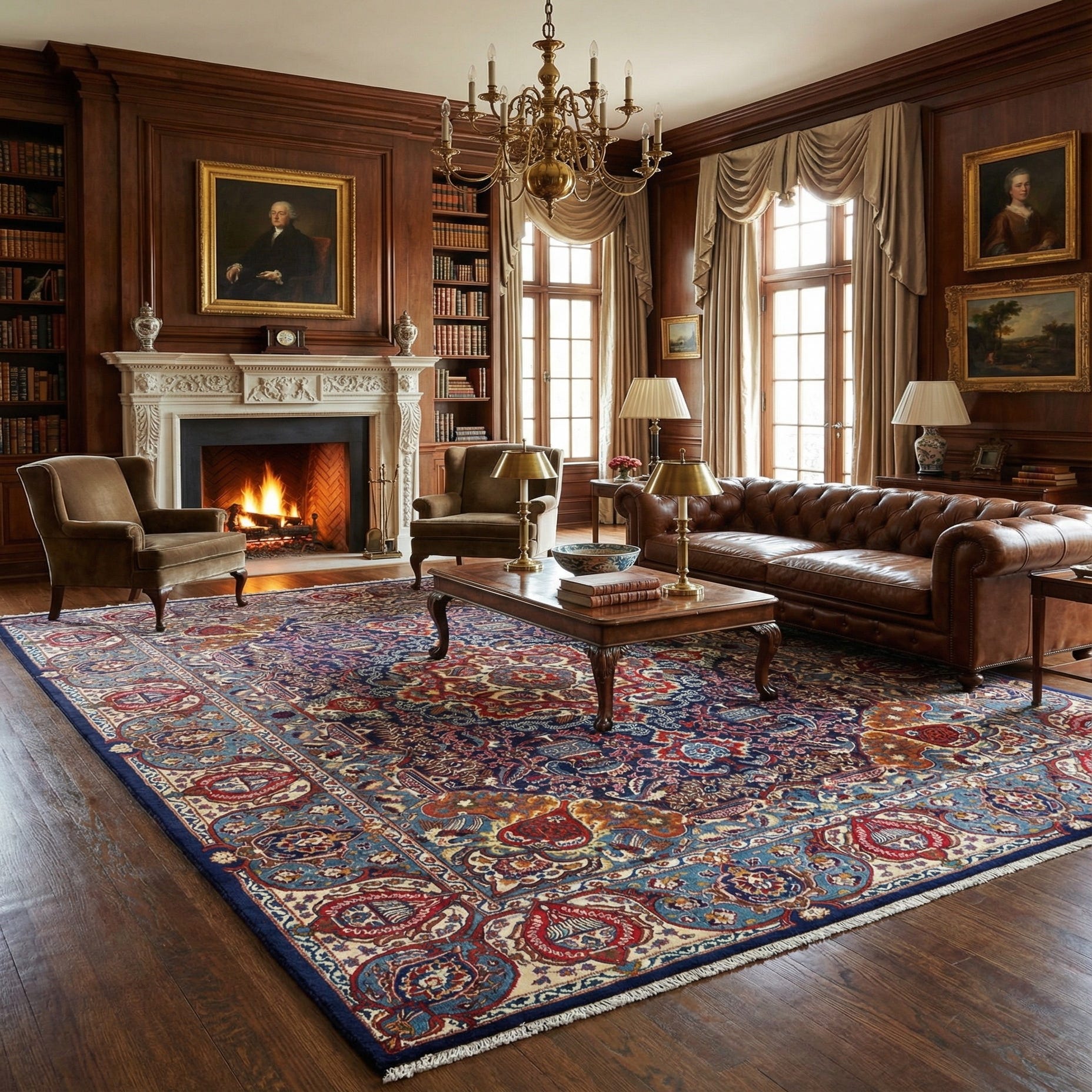 A large 10x13 rectangular Kashmar Persian rug in shades of blue, red, and cream, featuring intricate floral and medallion patterns.