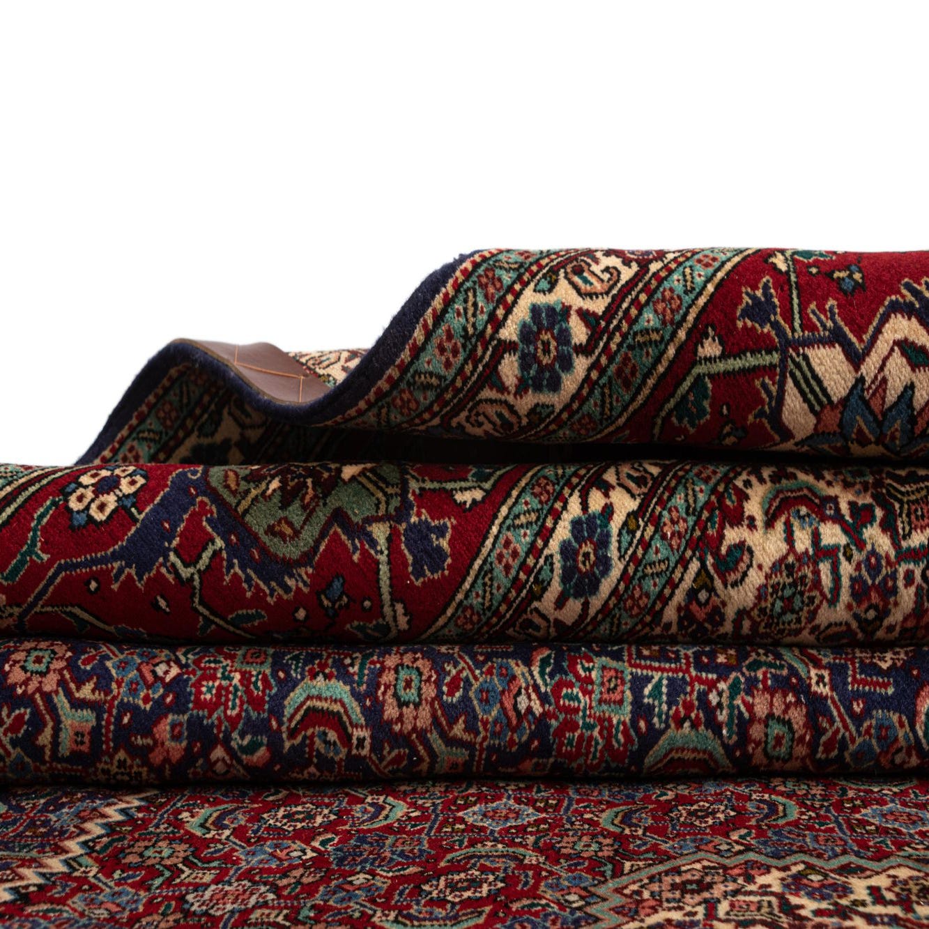 Dense, hand made of wool and richly patterned, this Persian-inspired rug centers on a deep diamond medallion set against a dark blue field. The interior of the medallion is a warm red peppered with finely detailed floral and boteh motifs that repeat across the field in navy and rust tones, while ivory corner spandrels and a bold red outer border ground the composition. The weave reads tactile—soft, slightly springy wool with a low-to-medium pile that invites bare feet and adds visual warmth under furniture.