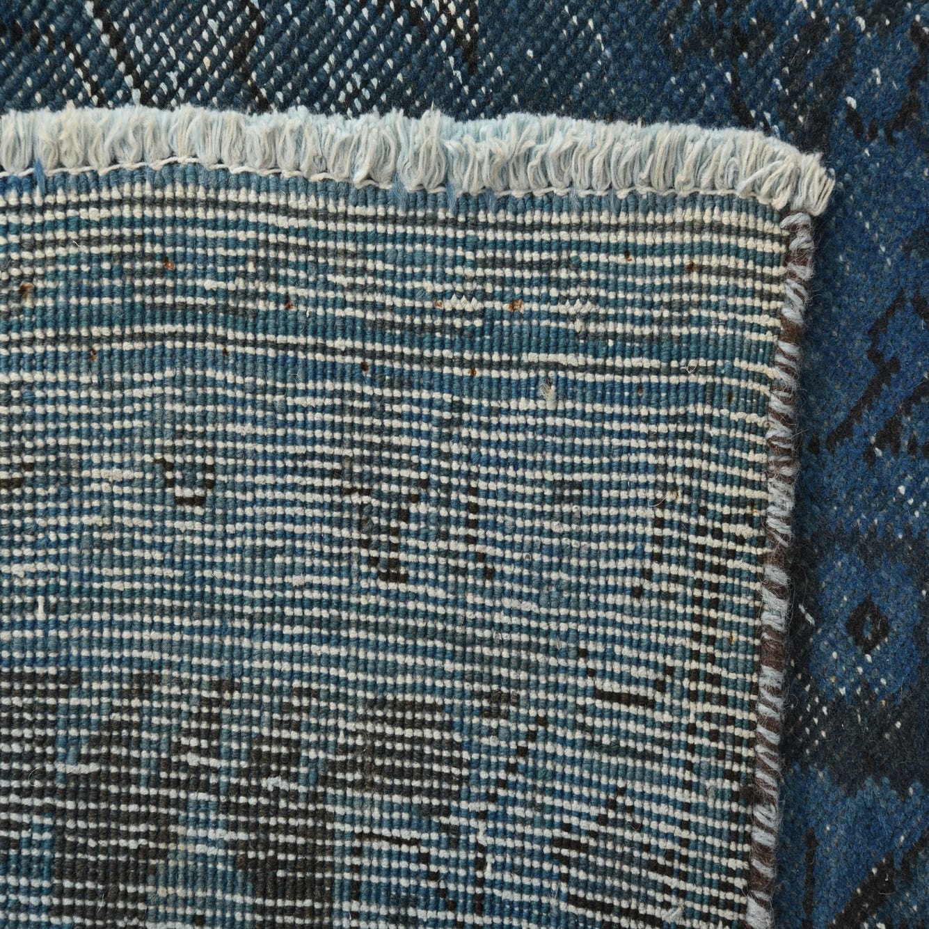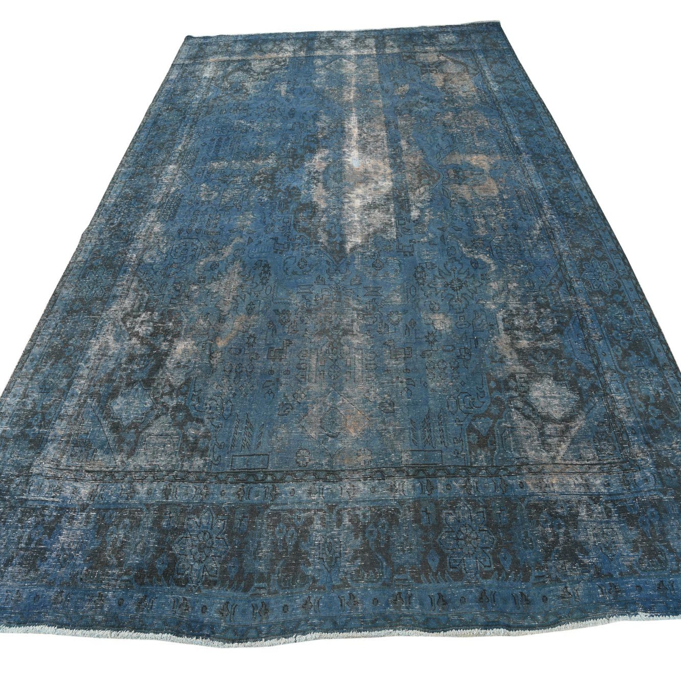 A 10x13 rectangular blue Persian-style wool rug with a distressed, vintage look and subtle medallion pattern.
