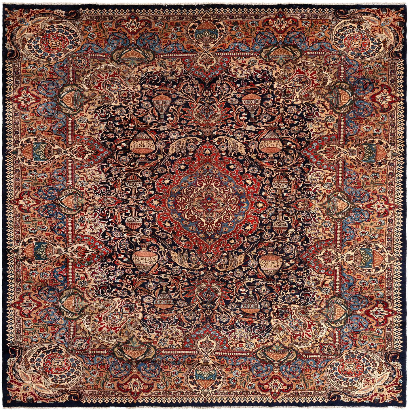 Primary color is Dark Blue. Colors in this rug include: Dark Blue, Dark Blue, Cream, Red, Grey, Orange, Blue, Green.