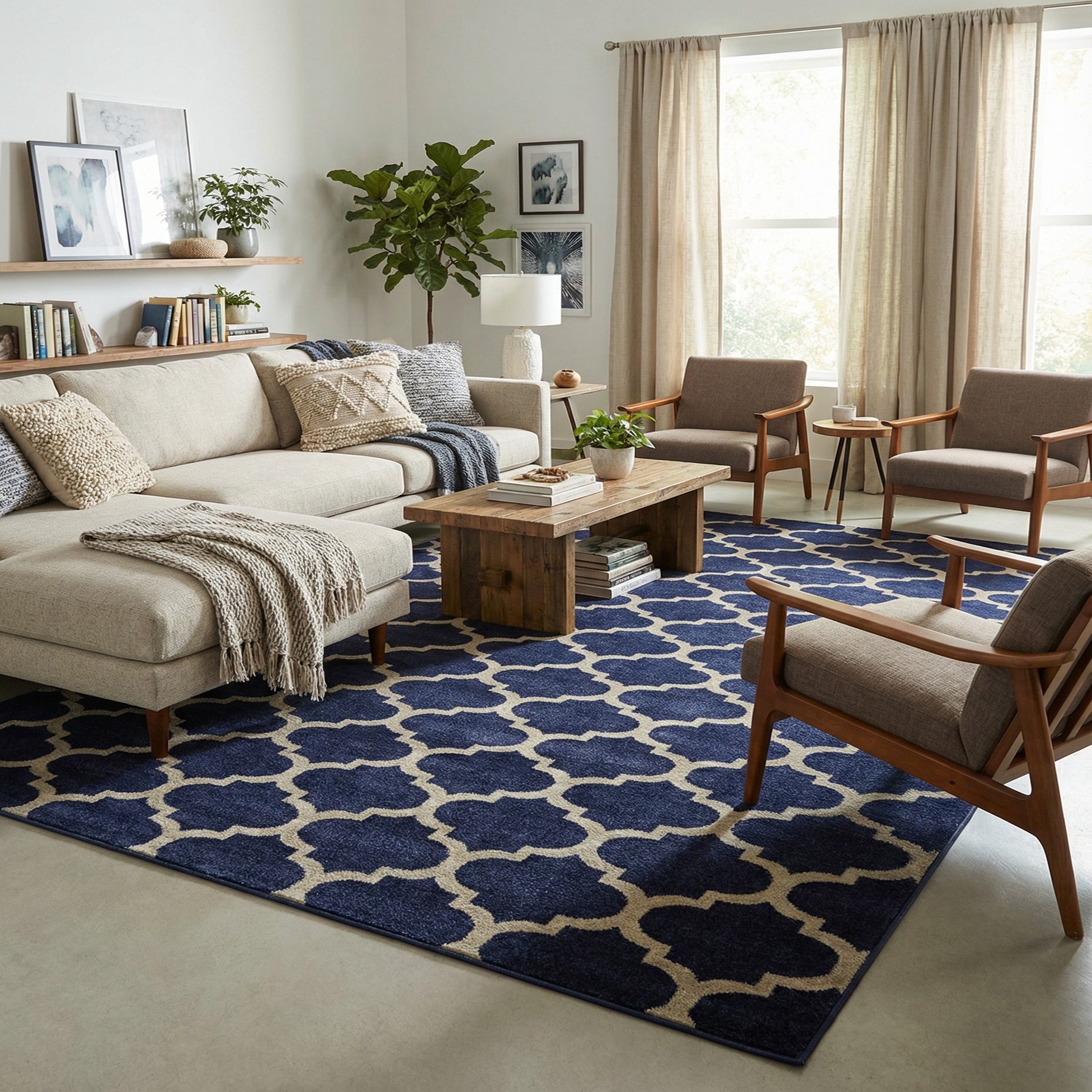 This rug is well suited to anchor a large seating area or sit beneath a dining table, bringing a strong visual foundation to living rooms, dining rooms, or home offices. It pairs nicely with light wood or painted furniture and neutral textiles, and complements transitional, coastal, or contemporary-traditional interiors where a clean, structured pattern and rich navy tones are desired.