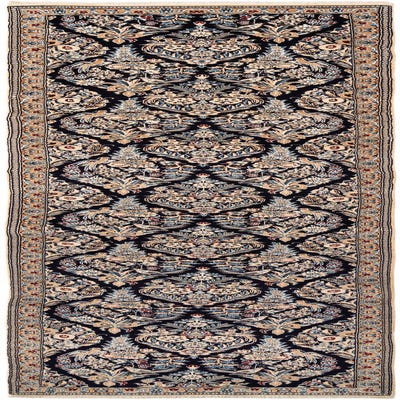 A dark blue 11 ft runner rug with an intricate traditional floral and bird pattern in cream, light blue, and red, framed by a beige border.