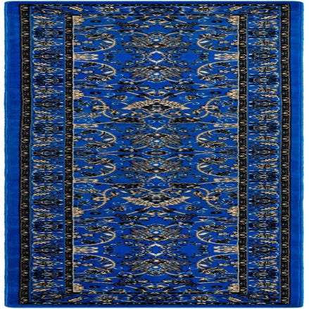 Primary color is Dark Blue. Colors in this rug include: Dark Blue, Black, Cream, Gray.
