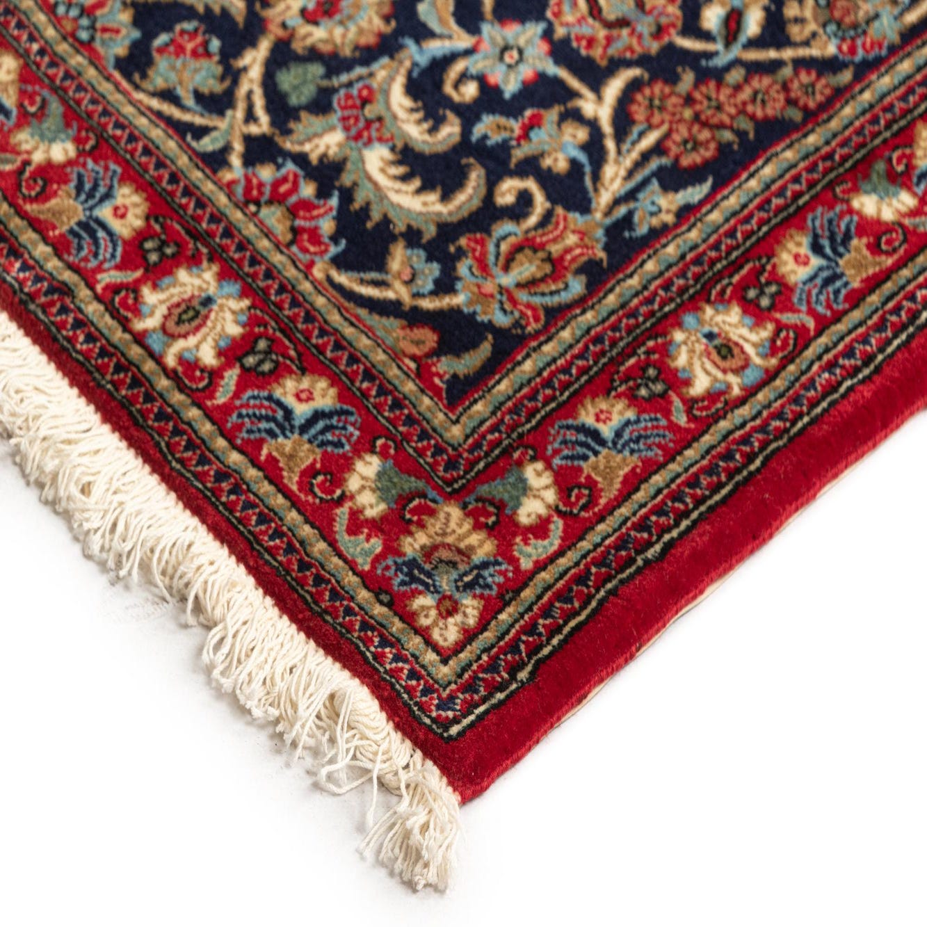 This Ghom collection 13 ft runner rug is handcrafted from wool and presents a sophisticated design that can enrich any long and narrow space in the home. The background color is a deep and rich dark blue, providing a bold canvas for the intricate patterns that adorn this piece. The design features a traditional and symmetrical motif filled with a variety of shapes and flourishes, including floral elements and precise geometric outlines. A blend of reds, creams, and complementary accents give this rug a classic yet vibrant palette, which can introduce warmth and elegance into a space.