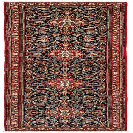 Ideal for incorporating into classic, traditional interiors, this runner complements wood flooring, provides a striking contrast against light tiles, and could harmonize with rich leather furnishings. It would also fit well in transitional spaces that blend modern minimalism with classic design elements, serving as a statement piece in an otherwise understated decor. This rug's dark blue background and vibrant pattern are versatile enough to add depth to a variety of color schemes, making it perfect for hallways, entryways, or alongside a long dining table.