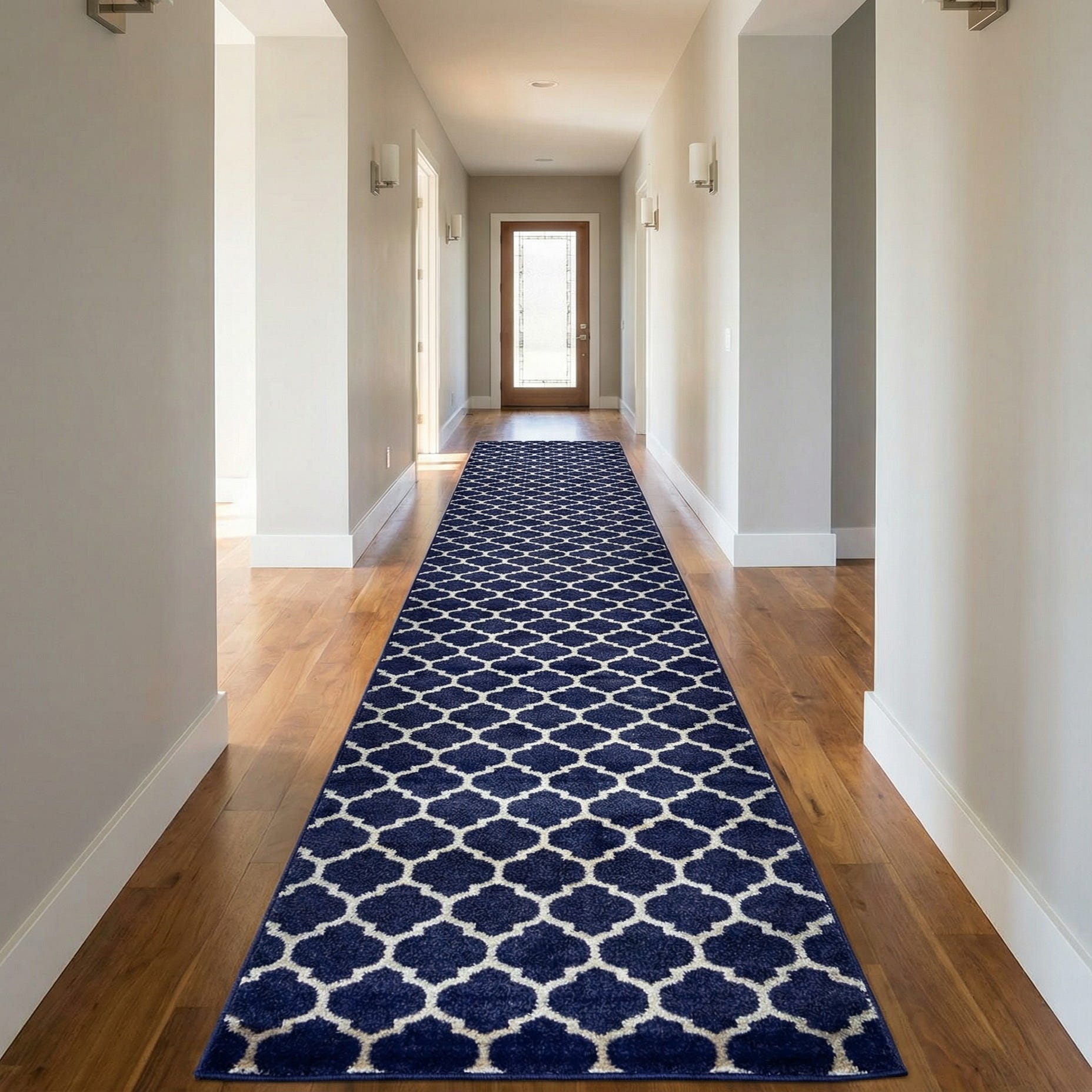 Ideal as a runner for hallways, entryways, or alongside a bed, this design brings a structured, modern-traditional look without overpowering surrounding décor. Pair it with light wood floors and white trim for a fresh contrast, layer it beneath a slim console table in transitional spaces, or coordinate with navy upholstery and brass accents for a cohesive, contemporary feel.