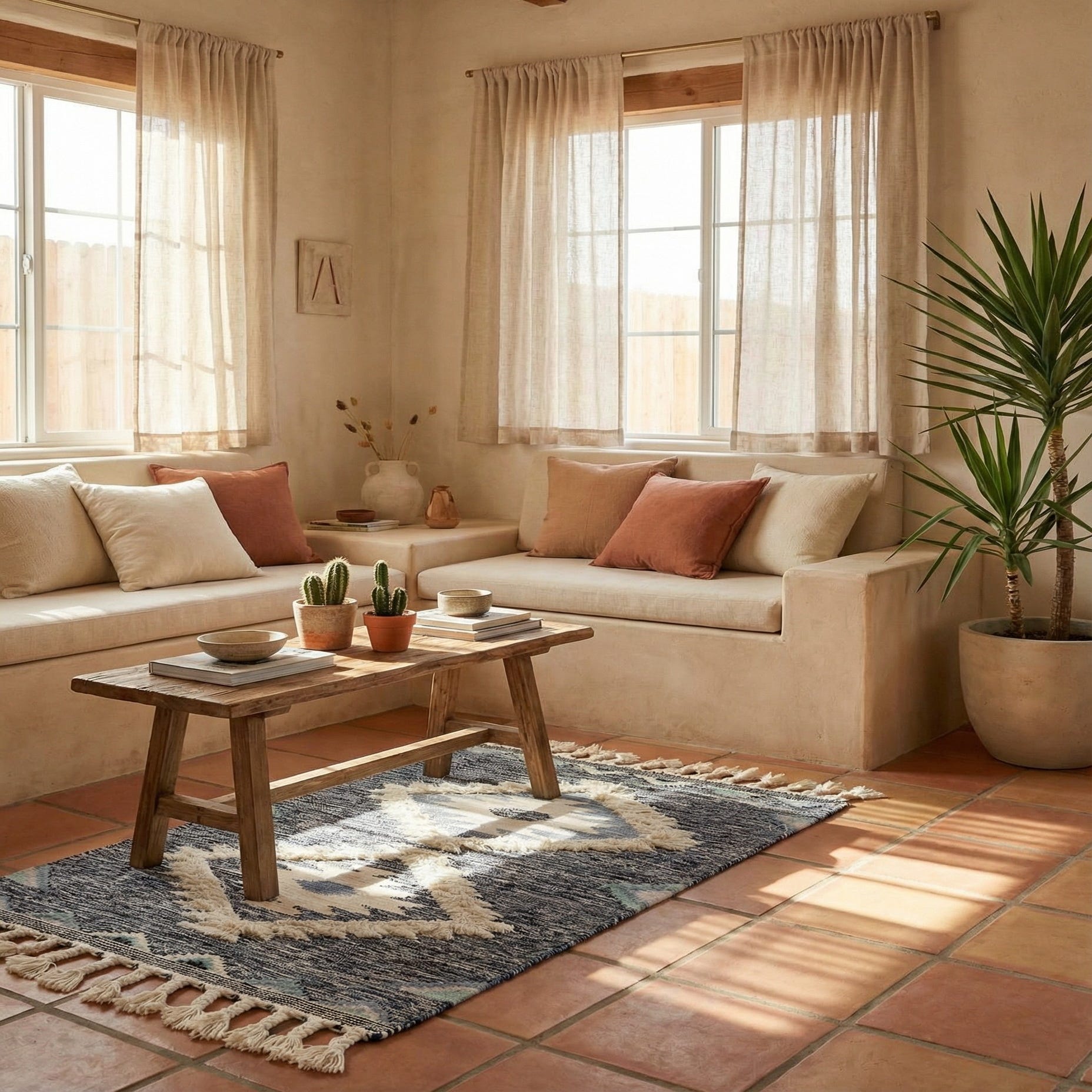 Place this rug where pattern and texture can anchor a room: layered in a casual living room under a coffee table, at the foot of a bed to add visual interest, or in an entryway to welcome guests with warmth and color. Its dark blue background and soft green highlights pair well with natural woods, neutral upholstery, and matte black or brass accents, making it easy to integrate into modern farmhouse, coastal cottage, or relaxed contemporary interiors.