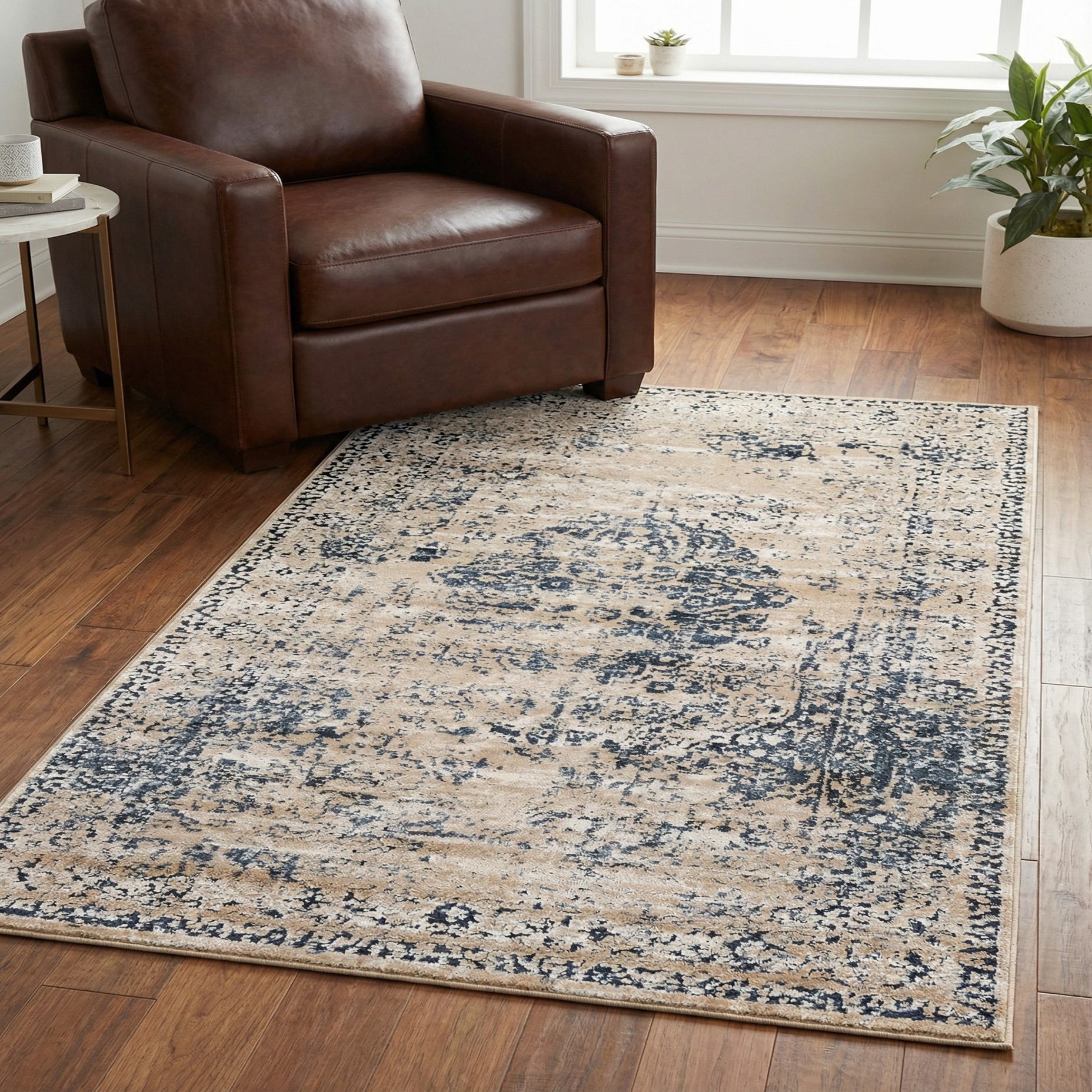 This palette and texture work well in a range of interiors: pair it with light wood furniture and cream upholstery for a coastal or transitional living room, place it beneath a small dining table to introduce layered color without overwhelming the space, or slide it into a bedroom to add depth at the foot of the bed. The dark blue base provides a strong contrast to neutral linens and brass or matte-black accents, and the distressed pattern helps the rug blend seamlessly into both modern farmhouse and contemporary settings.