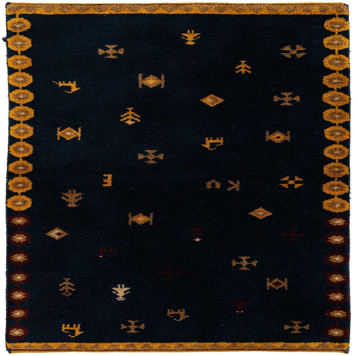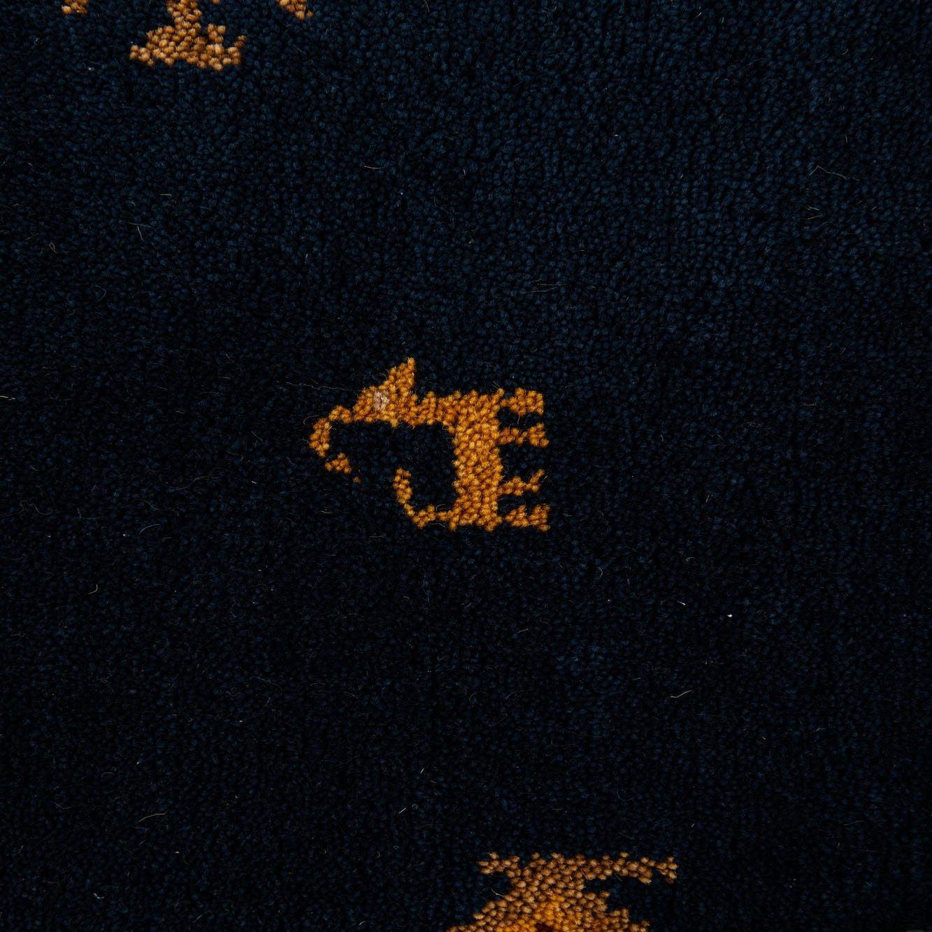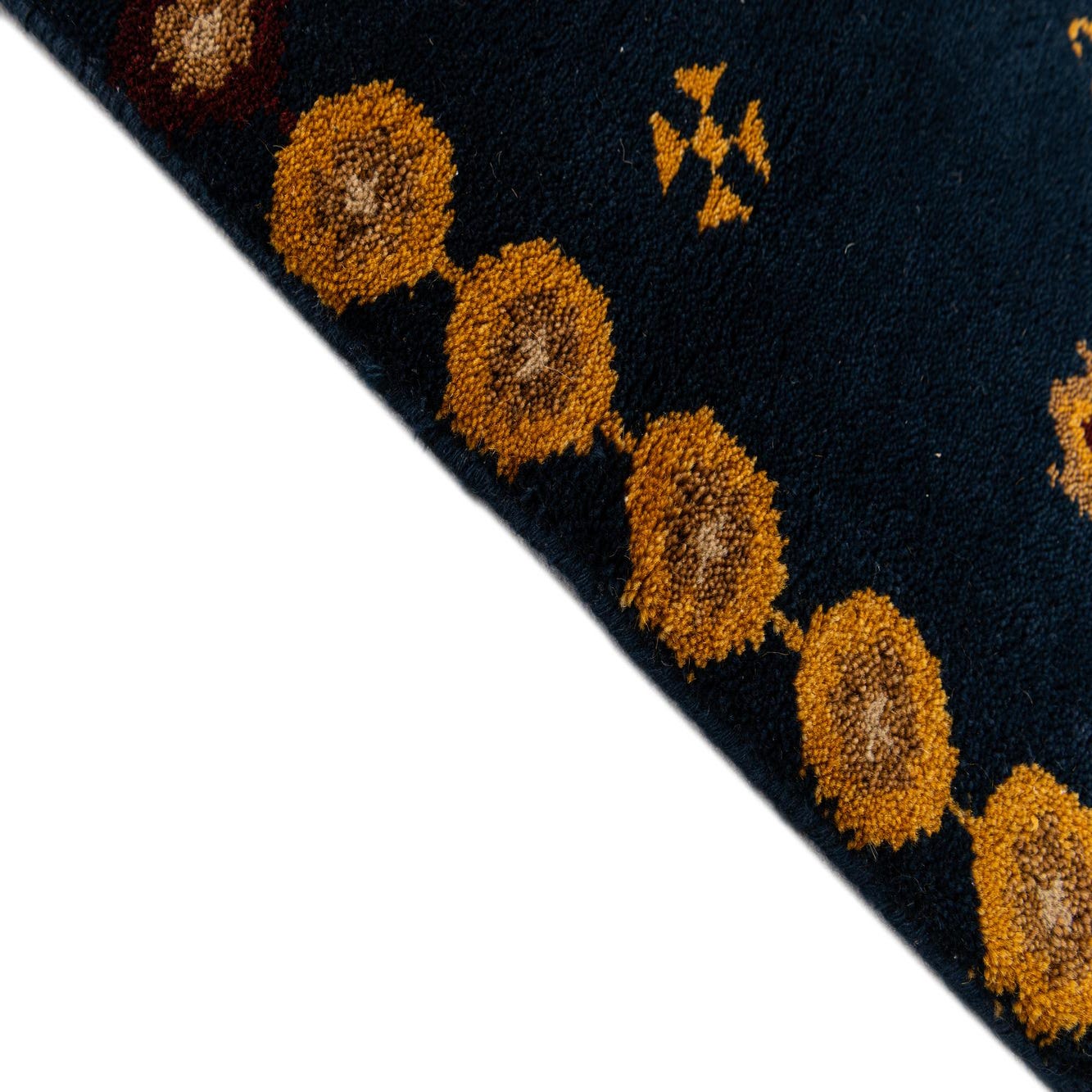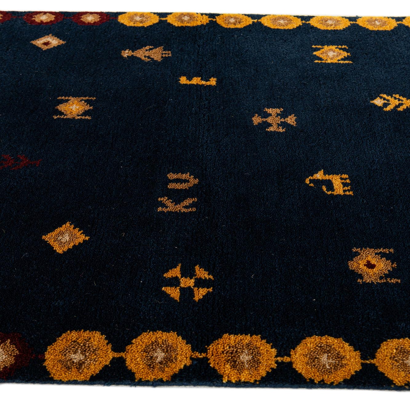 A 3x5 rectangular Gabbeh rug in deep blue with scattered gold, brown, and red tribal motifs and a decorative border.