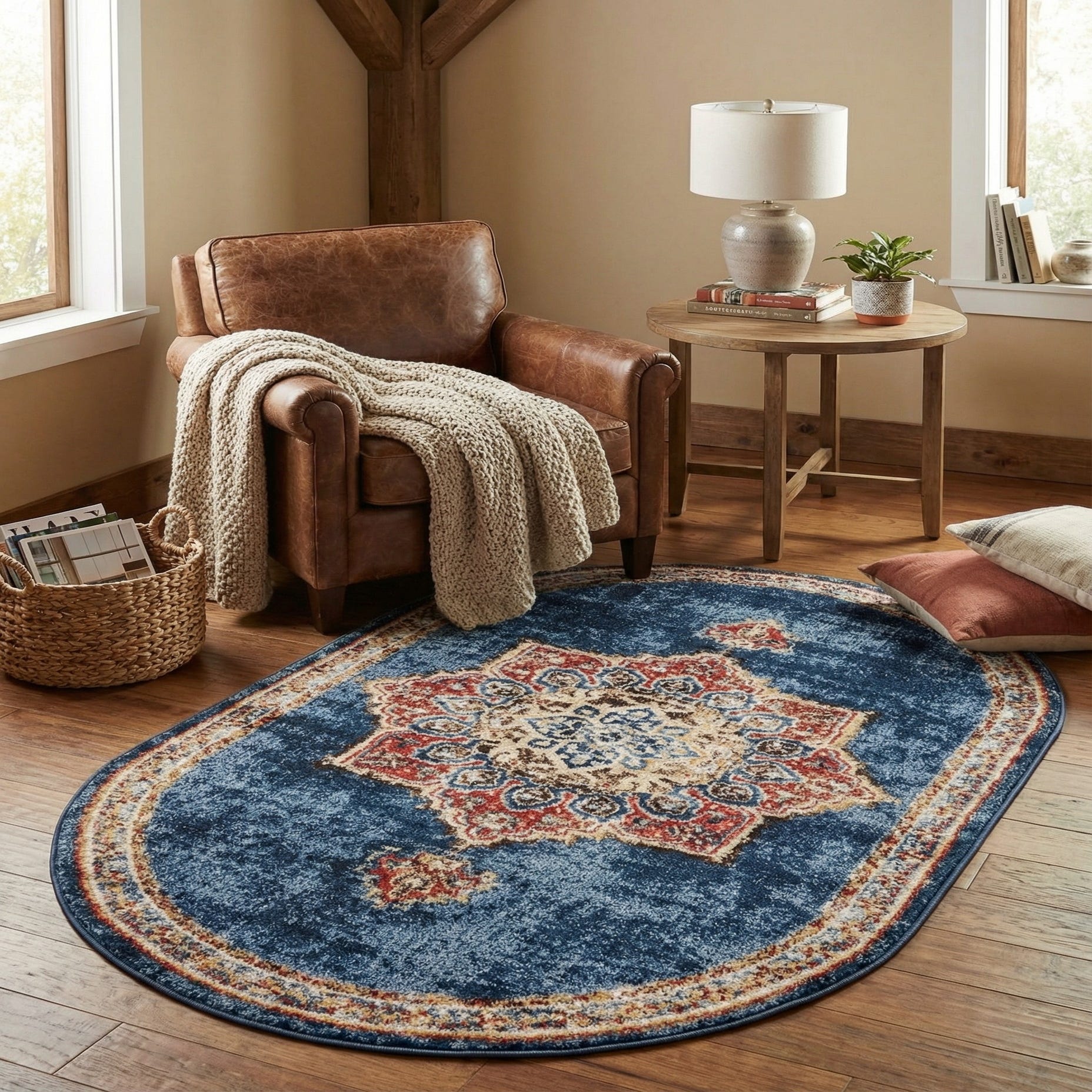 A classic medallion pattern sits at the heart of this oval rug, where a layered floral motif in cream, light blue, rust red, orange and gold contrasts against a deep dark blue field. The design carries a gently distressed finish and a narrow, multicolored border that frames the medallion and adds visual depth. Machine made of 100% polypropylene, the rug has a soft, low-to-medium pile with a subtle sheen and a dense, even texture that feels smooth underfoot while holding its pattern definition.