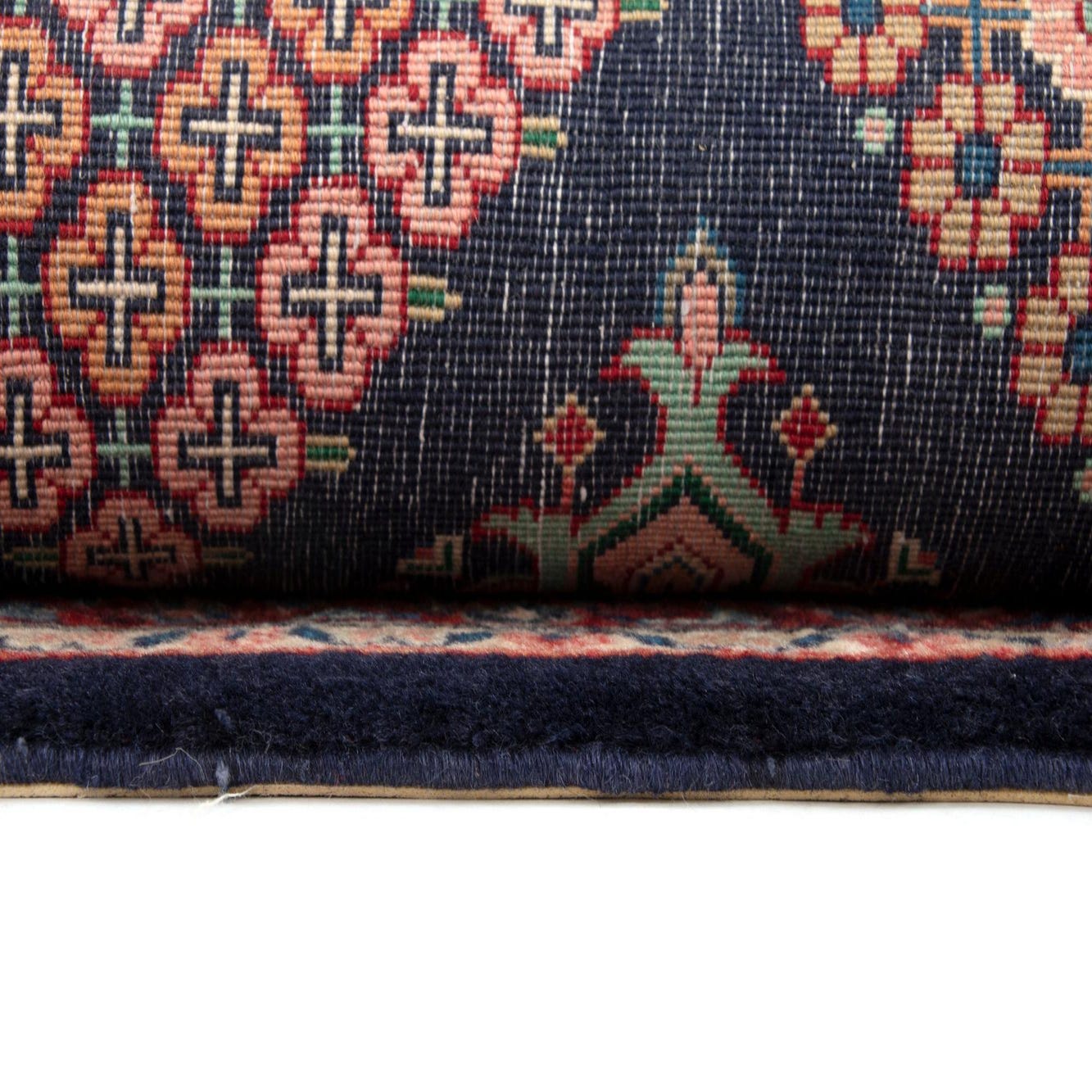 Primary color is Dark Blue. Colors in this rug include: Dark Blue, Red, Green, Pink.