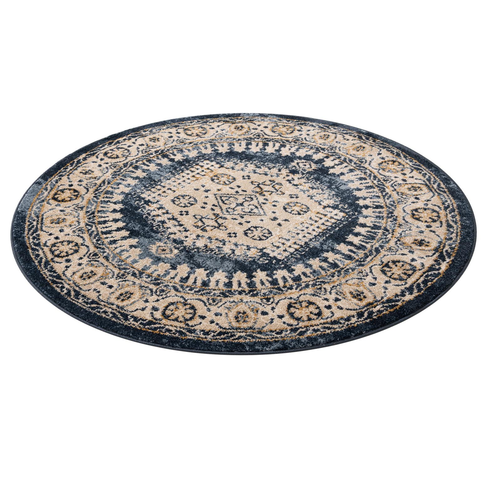 A rich, dark blue field anchors this round rug, where a central medallion and concentric borders unfold in ivory, tan, light blue and gold. The pattern blends traditional motifs—small floral rosettes, geometric accents and a scalloped outer band—into a gently distressed, vintage-inspired surface. Gold highlights catch the eye against the deeper navy, while the lighter ivory and blue threads provide contrast and clarity to the intricate design.